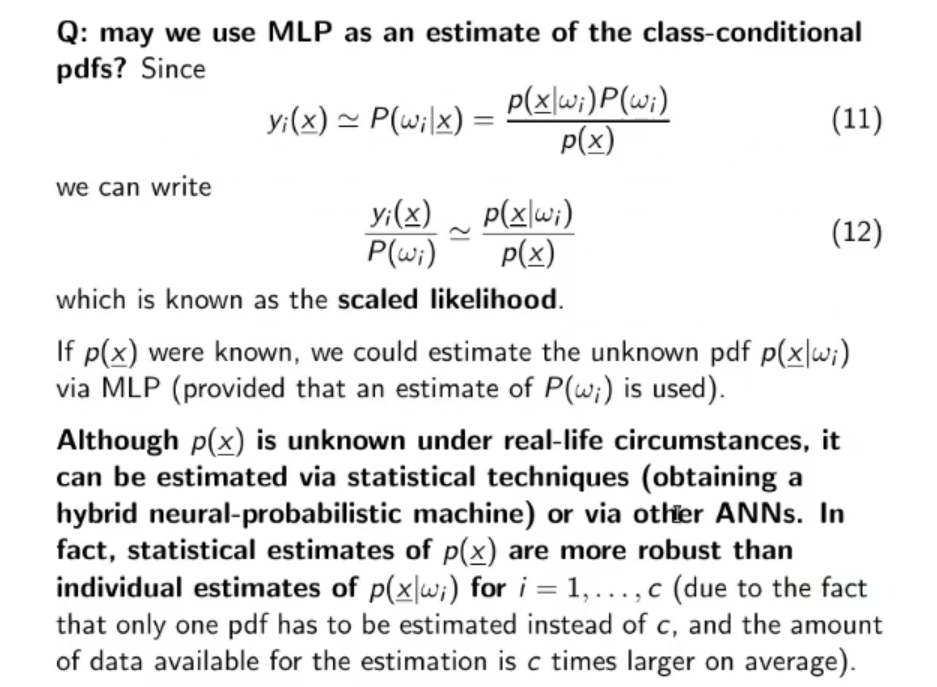 May we use MLP as an estimate of the class-conditional PDFs? Since the output of an MLP can be seen as: