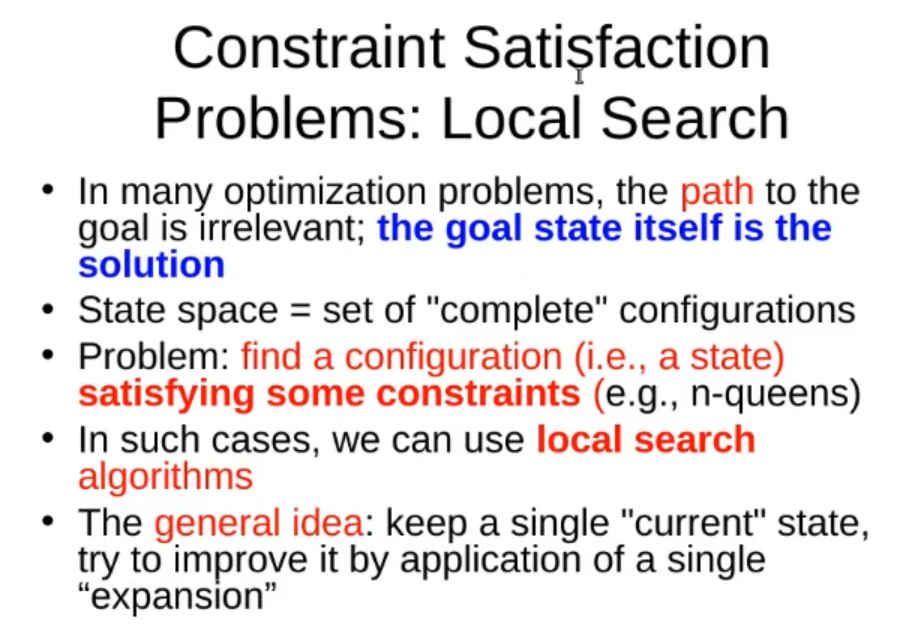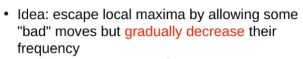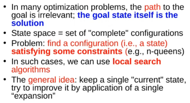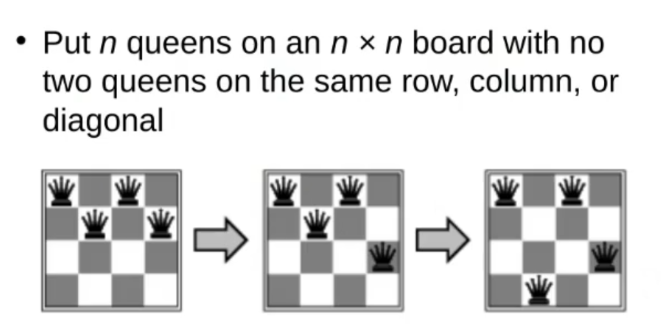 For example, in the -Queens puzzle using the hill-climbing algorithm we might find the optimal solution let’s say but if we are unlucky we might remain stuck on a solution .