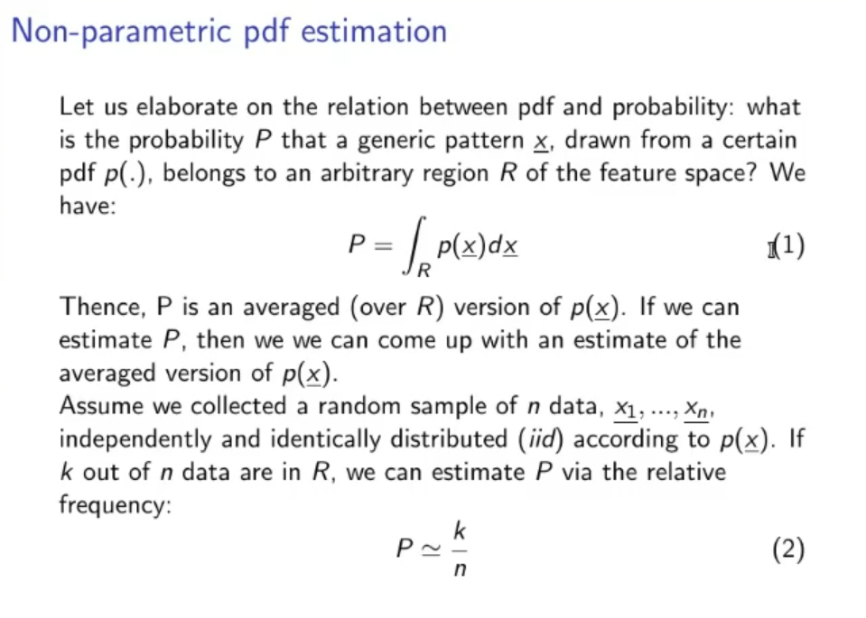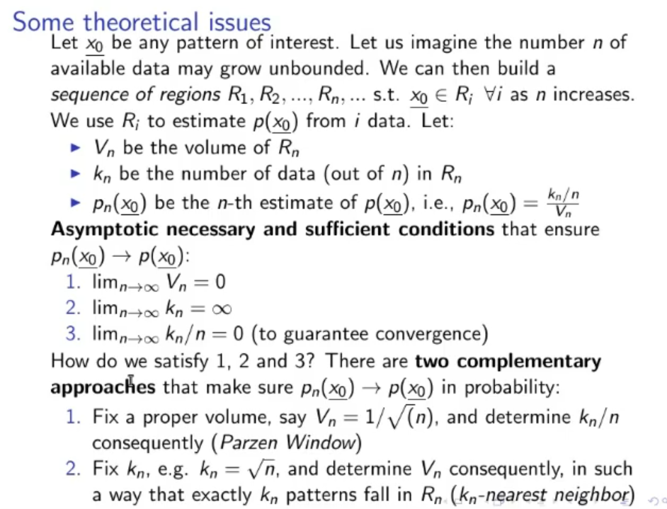 As (our number of data) increases, so does our region: , where the subscript means the number of data in the region, such that belong to each of them, , where is our pattern of interest (~Ex.: we are searching for the pdf of males in a specific university, we use the region to estimate from data.