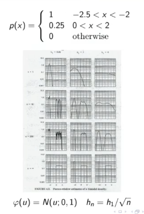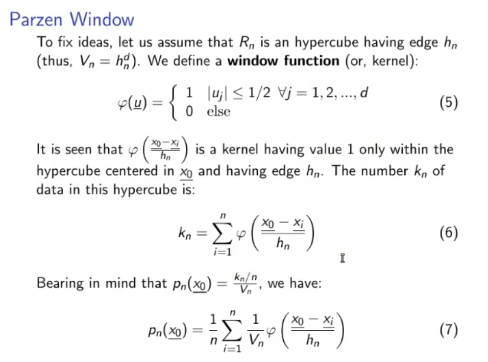 Parzen Window: Before training we can βfilterβ the data using a function, for example using the hypercube function that selects only the data in a specific region, an hypercube, wide , with dimensions (so its volume will be ). We have defined the βwindow functionβ or βkernelβ as: