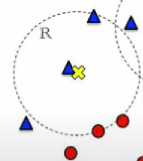 We classify this class (the yellow X) as 100% blue, because 2 blue dot are inside it and a red dot is just a little out of the region, so itβs presence is not considered during the classification.