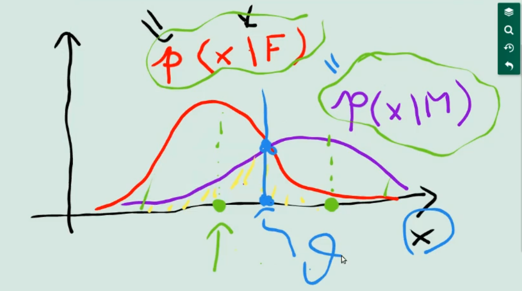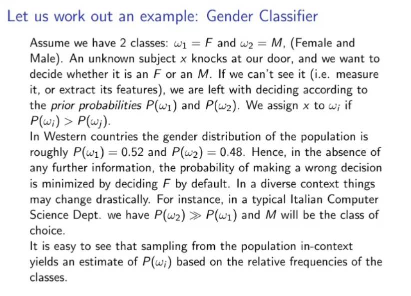 - : real probability that , the data or variable we want to classify belongs to/is identified as the class (~ex.: in reality the percentage of male and female is ).