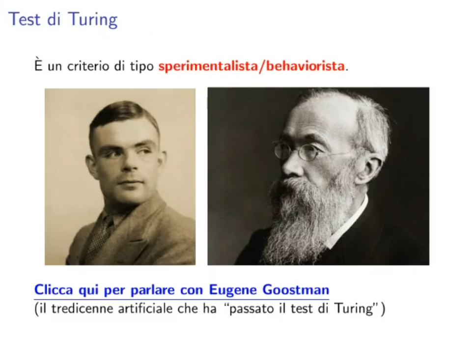 Turing Test: Un osservatore C deve riconoscere se l’interlocutore A è un computer o un essere umano, un computer si dice che ha passato il “Test di Turing” se riesce ad ingannare con successo C.