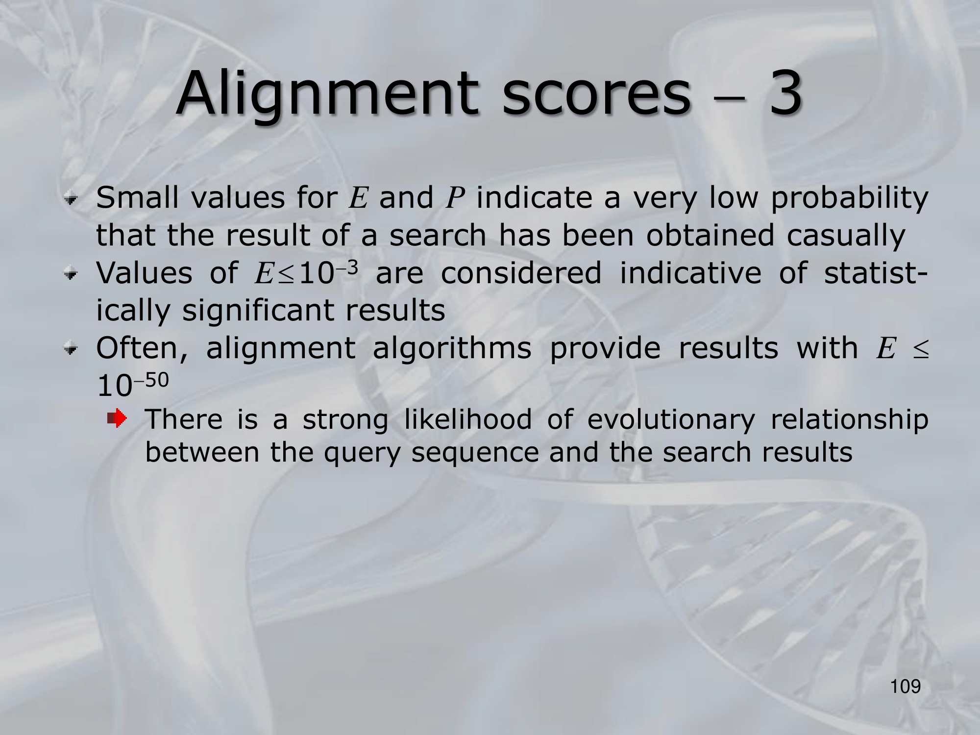 - : proportioanl to the expected number of random sequences with an alignment score . ( is statistically significant, but we often find , much better)