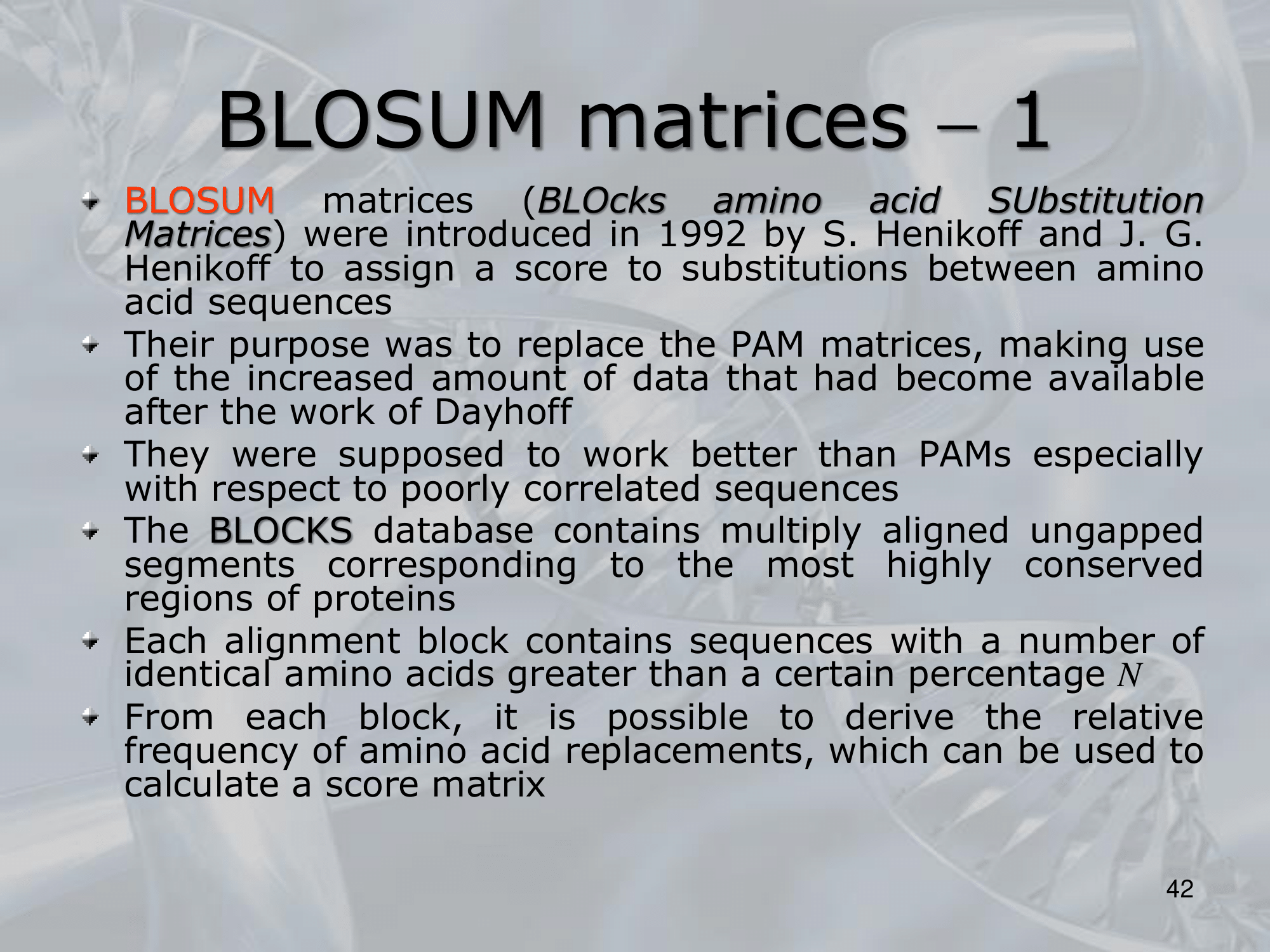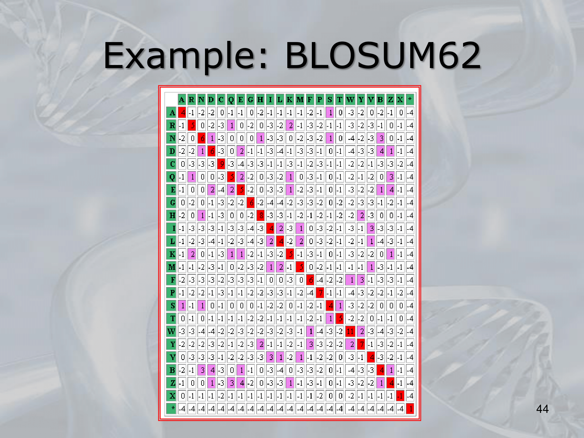IMPORTANTE BLOSUM Matricies (BLOcks amino acid SUbstitution Matricies) Created to substuite the PAM matricies, making better use of the increased amount of information available.