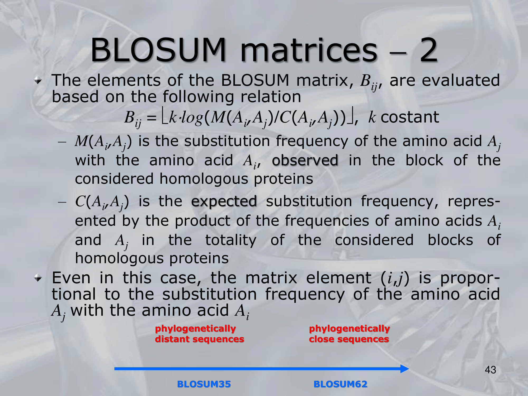 ==The element of a BLOSUM are proportional to the substitution frequency of amino acid and which are observed homologous proteins. The element of a BLOSUM are invertially proportional to the expected substitution frequency of amino acid and ==.