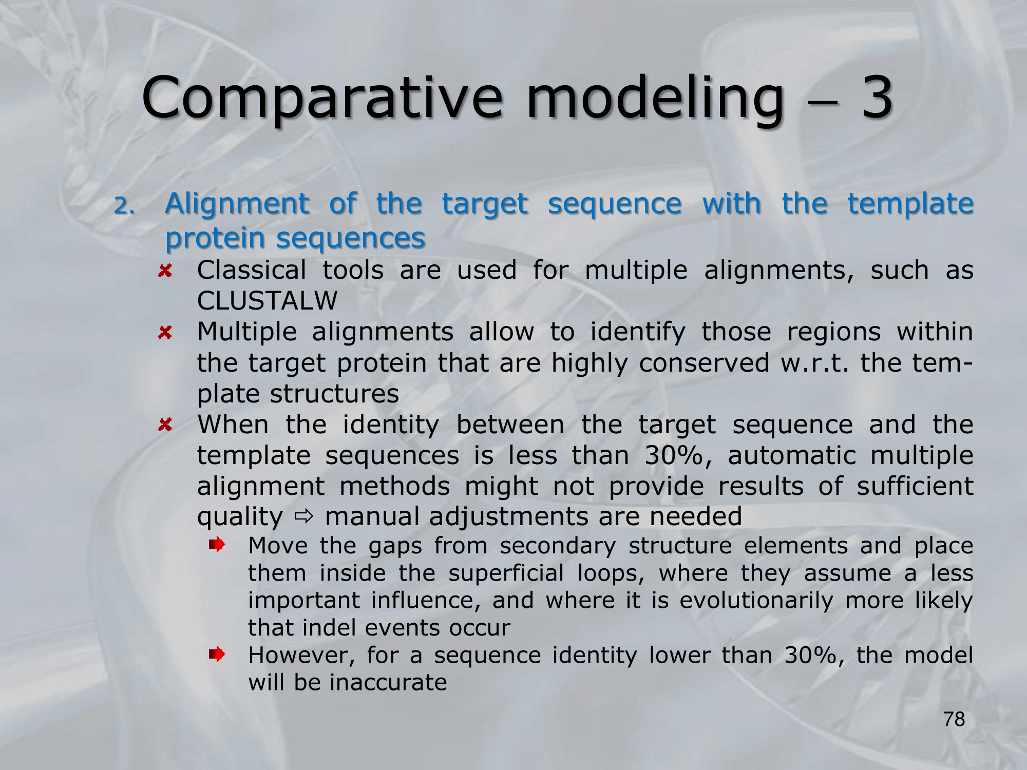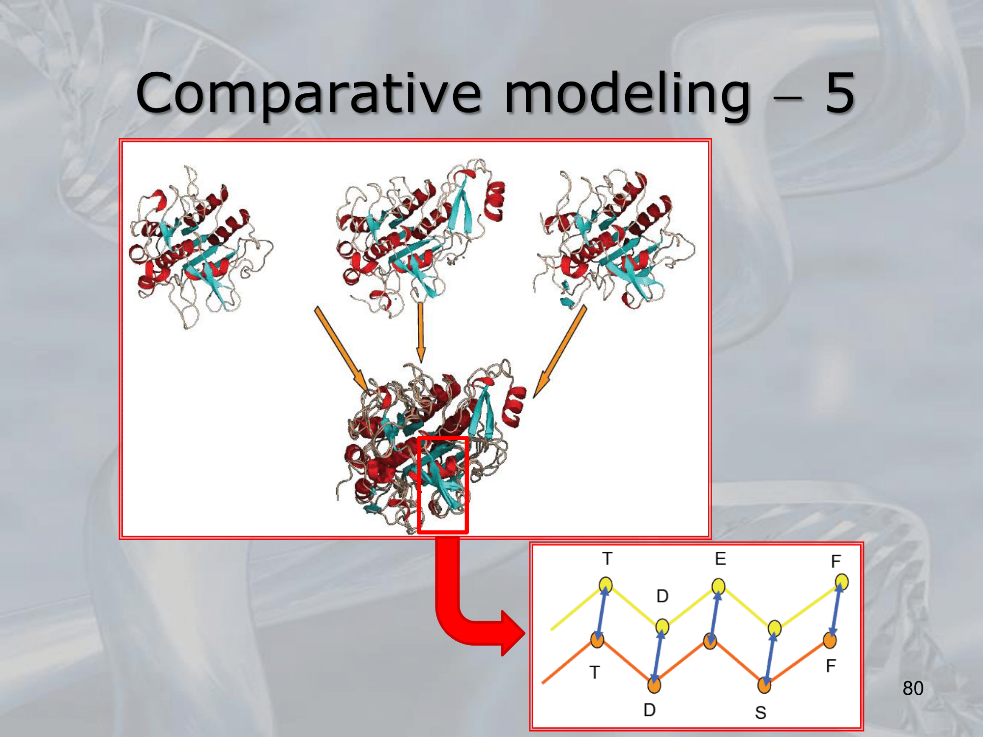 - Then, the alignment is used to generate a 3D model of the target protein structure based on the corresponding positions of amino acids in the template protein structure.