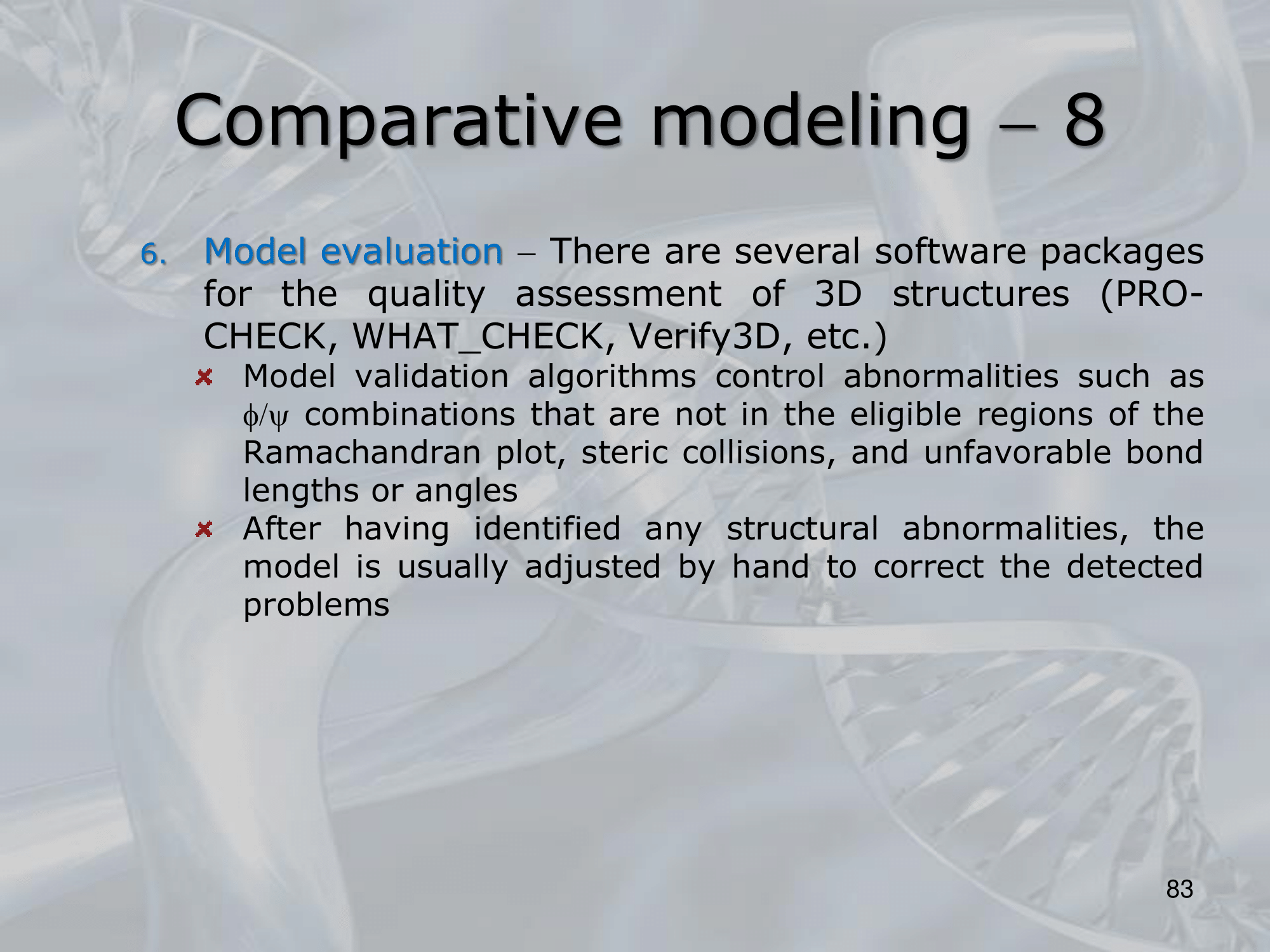 - Model Evaluation (using well known softwer packages: CHECK, WHAT_CHECK, Verify3D, )
