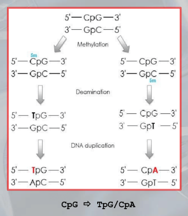 A specif enzyme, DNA methylase, attacs the methyl group to the cythosine, but only when it is present in dinucleotides . ==Due to methalyation and then deamination, the Cythosine of CpG dinucleotides, can turn into Tymine==.