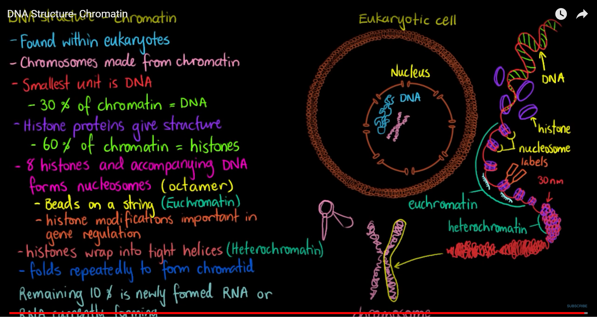 A Chromatin is a package composed of 30% DNA, 60% Histones and 10% RNA (newly formed or in the process of forming). Chromosomes are made from chromatin. Chromatin can be found in two forms:
