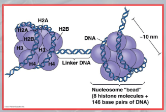 - Euchromatin: forming a shape like âbeads on a stringâ where the DNA is âloosly tide to the histonesâ and are the sites where genes are more active