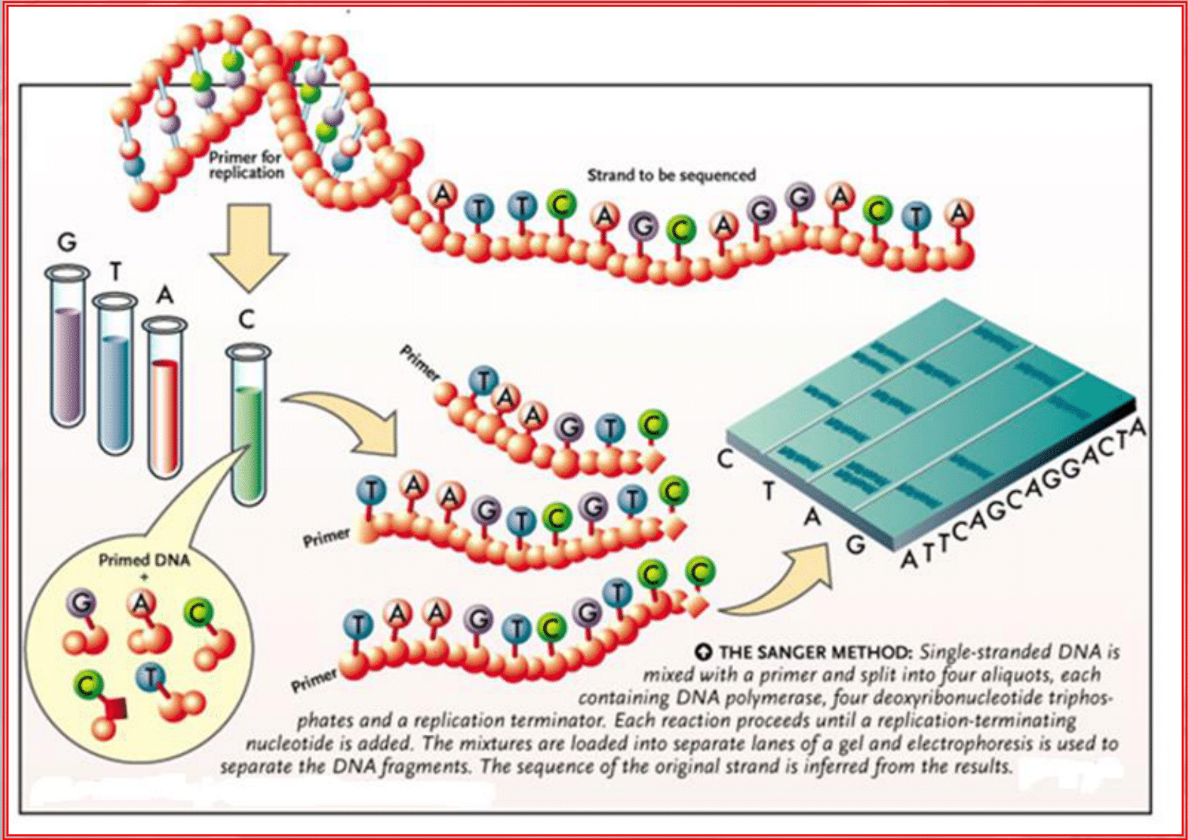 This results in a set of DNA fragments of varying lengths, each terminating with one of the four ddNTPs. - Gel electrophoresis: The DNA fragments are separated by size using gel electrophoresis.