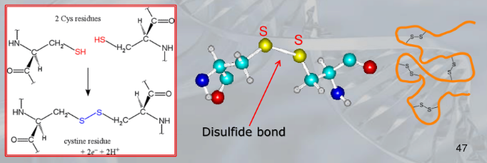 IMPORTANTE Disulfide Bonds: In the case of two cysteine residues it may happen that even if they are distant (in the amino acid chain), their sulfhydryl groups () oxidate (they lose ) and form a covalent bond know as disfulide bond.