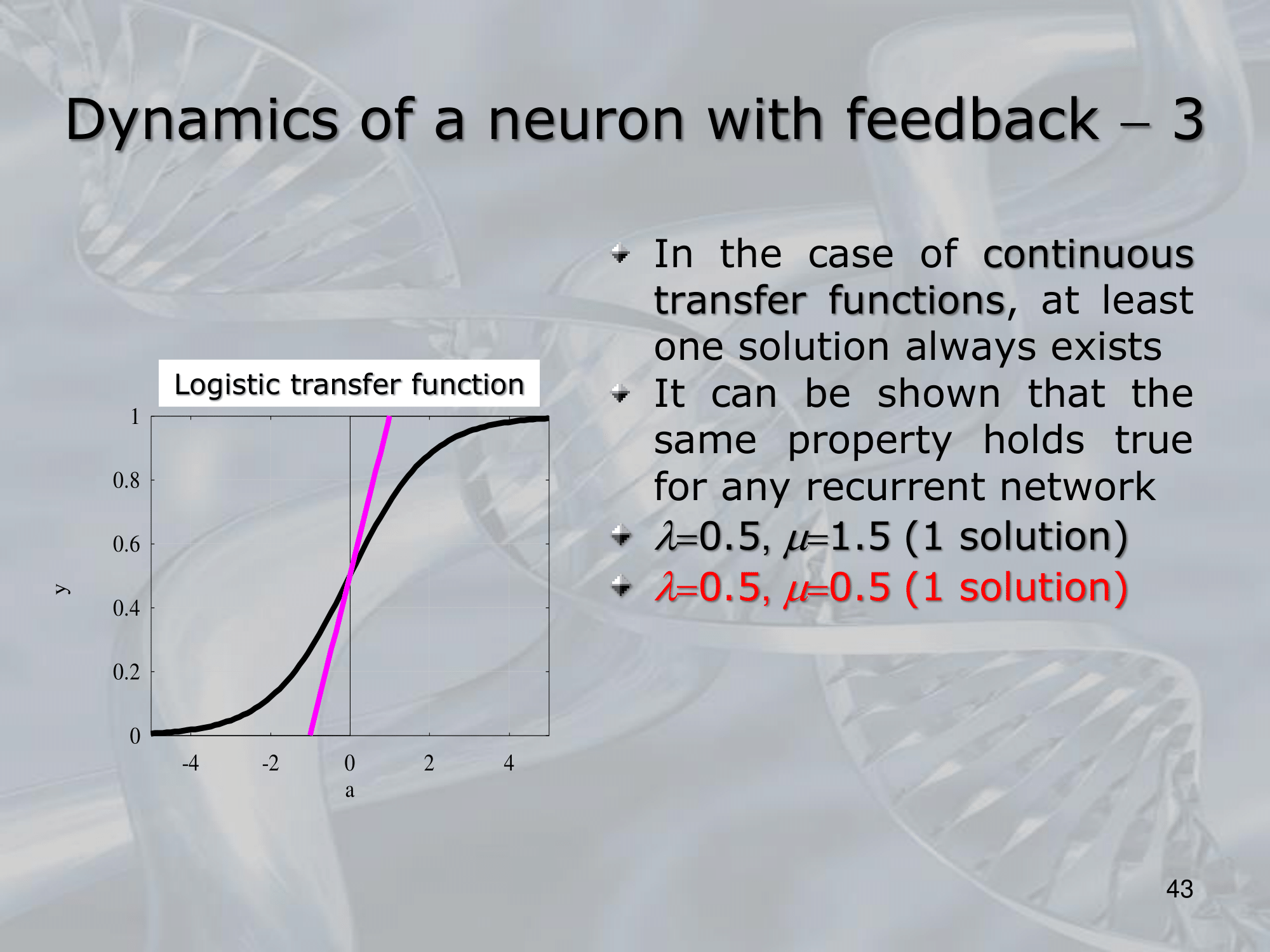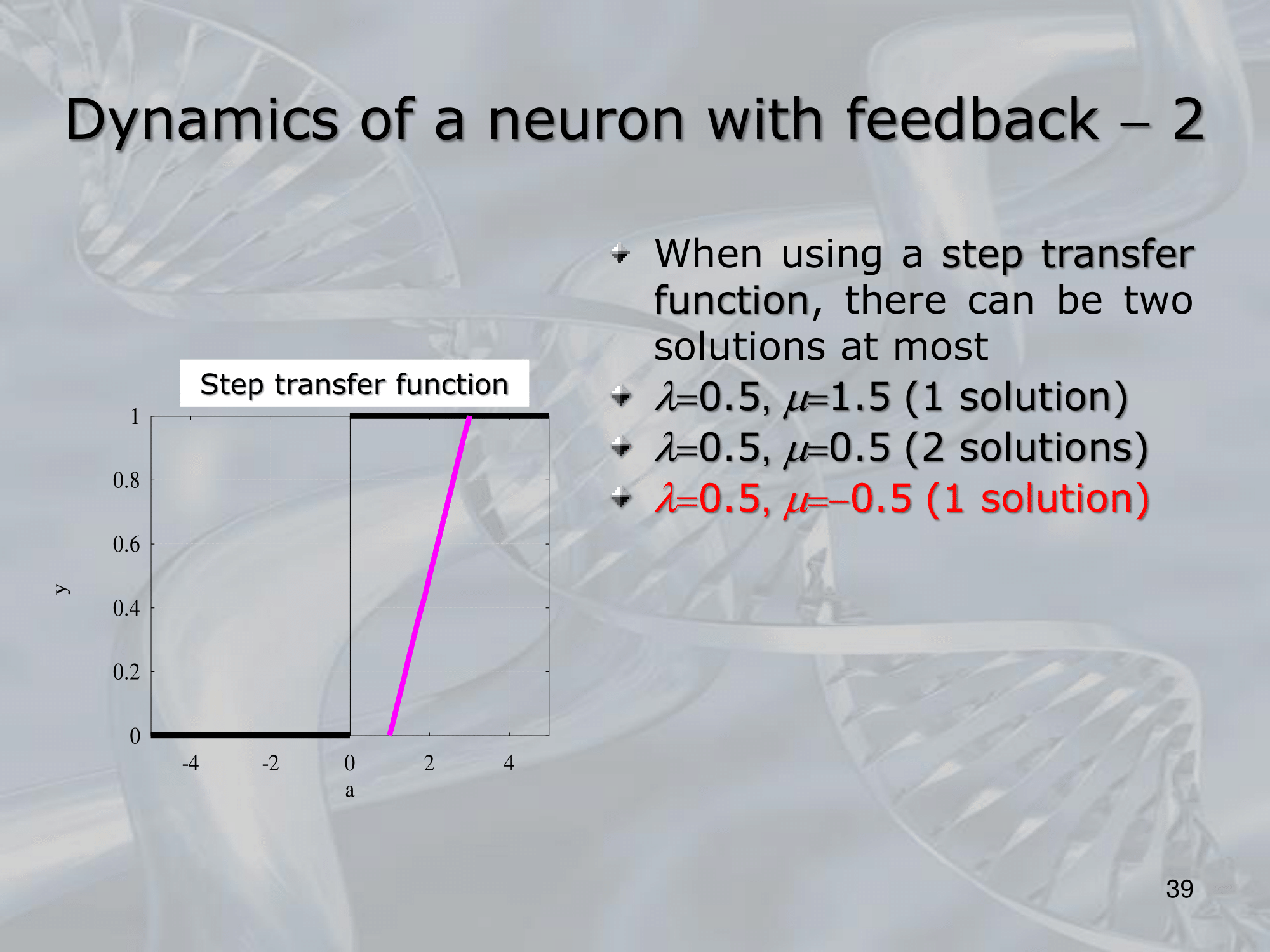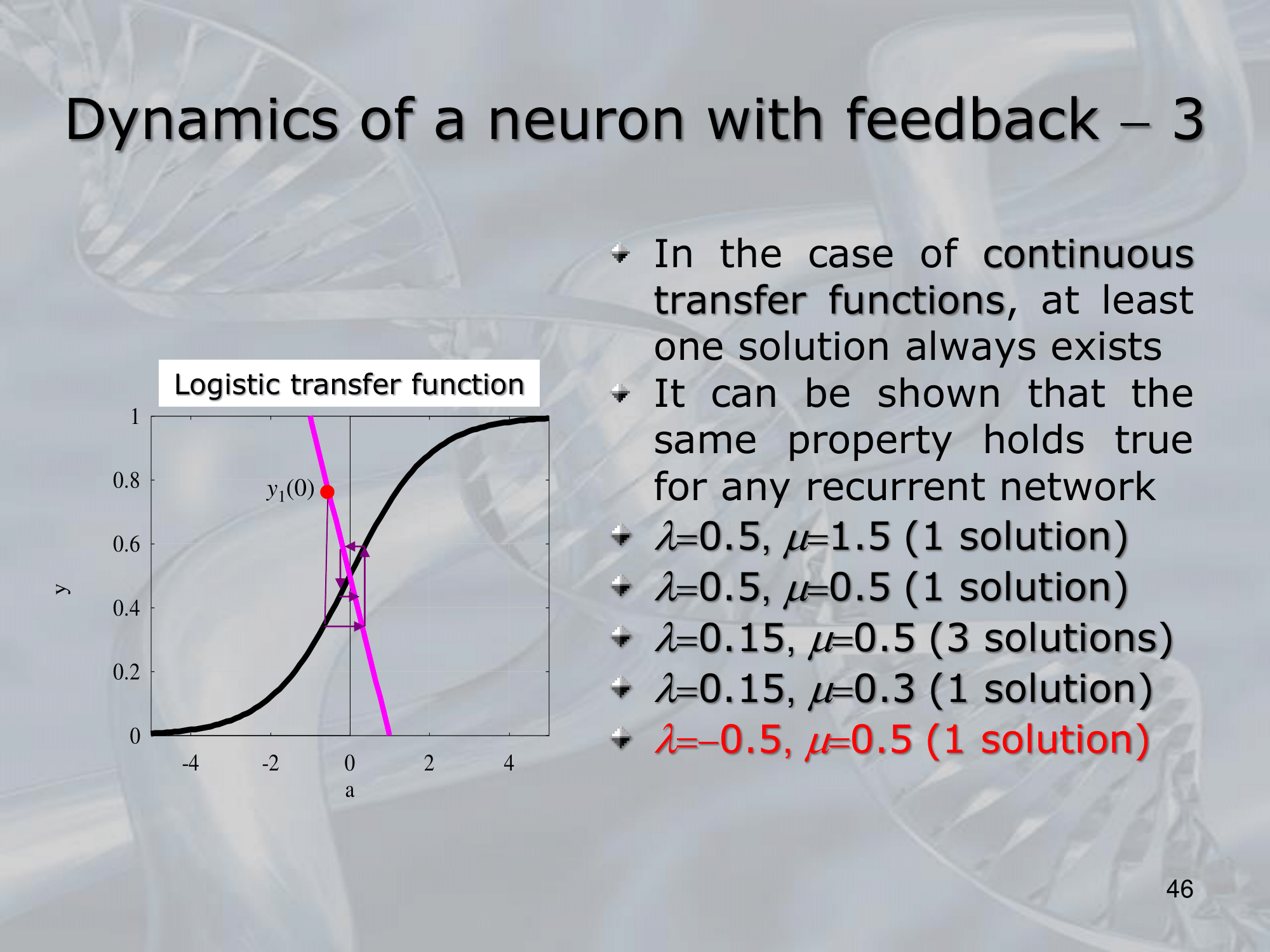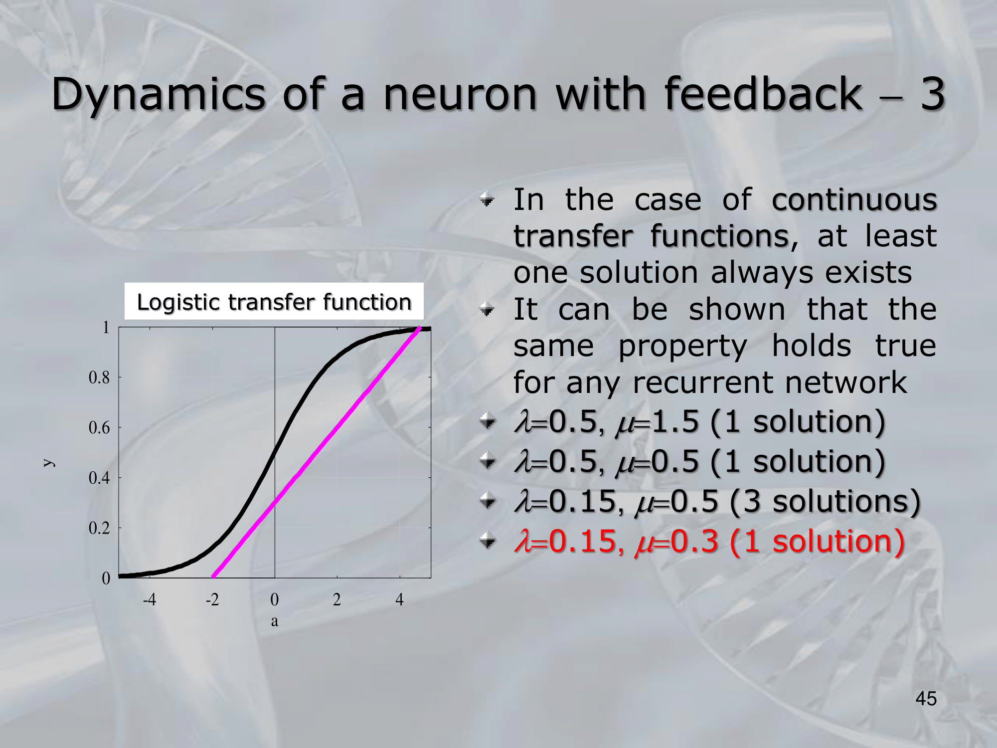 NOTE: As we can see this is an example on how the neuron with feedback founds a solution if it exists, in this case 3 solution exist, and the final result depends on the initial value . Formally this is the example of information latching.