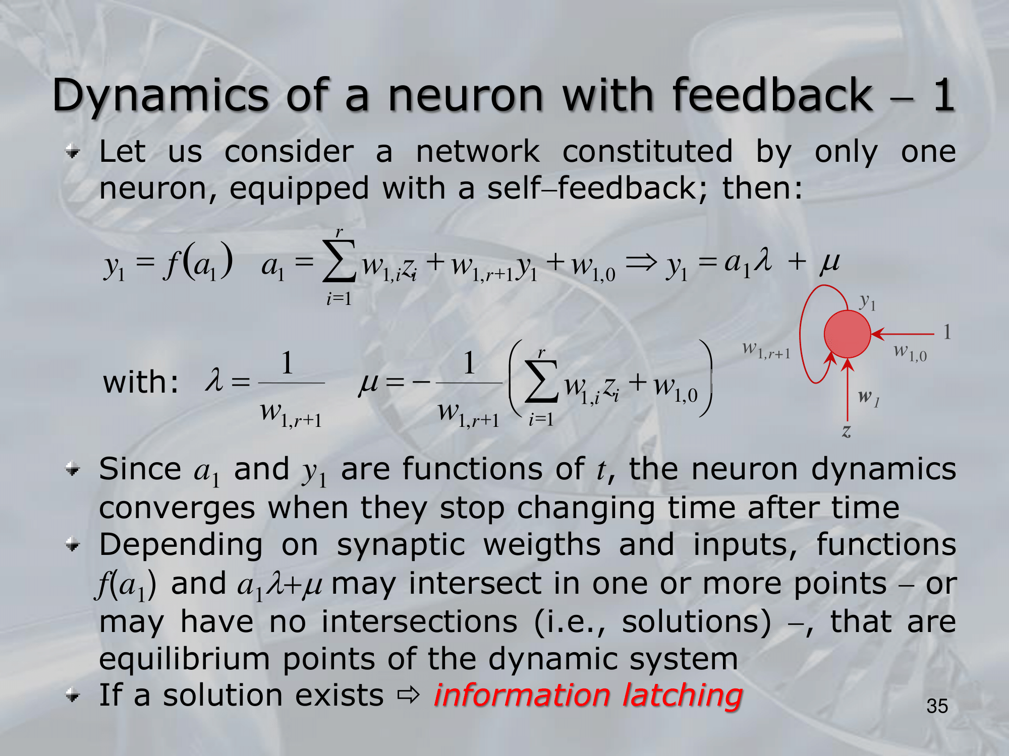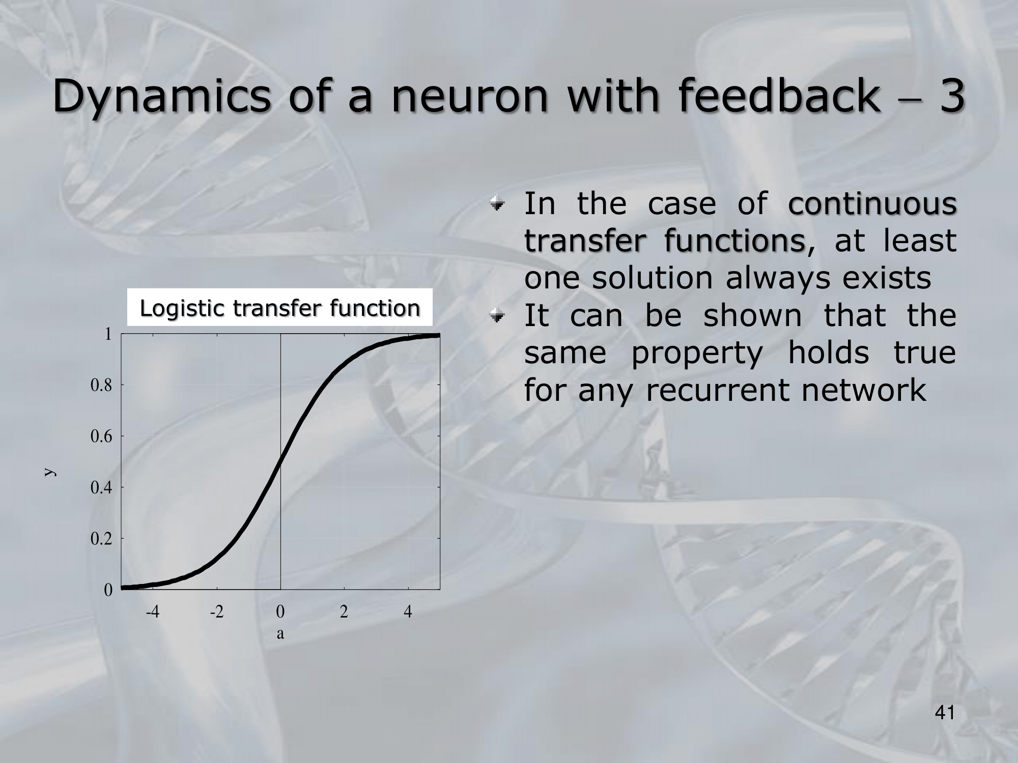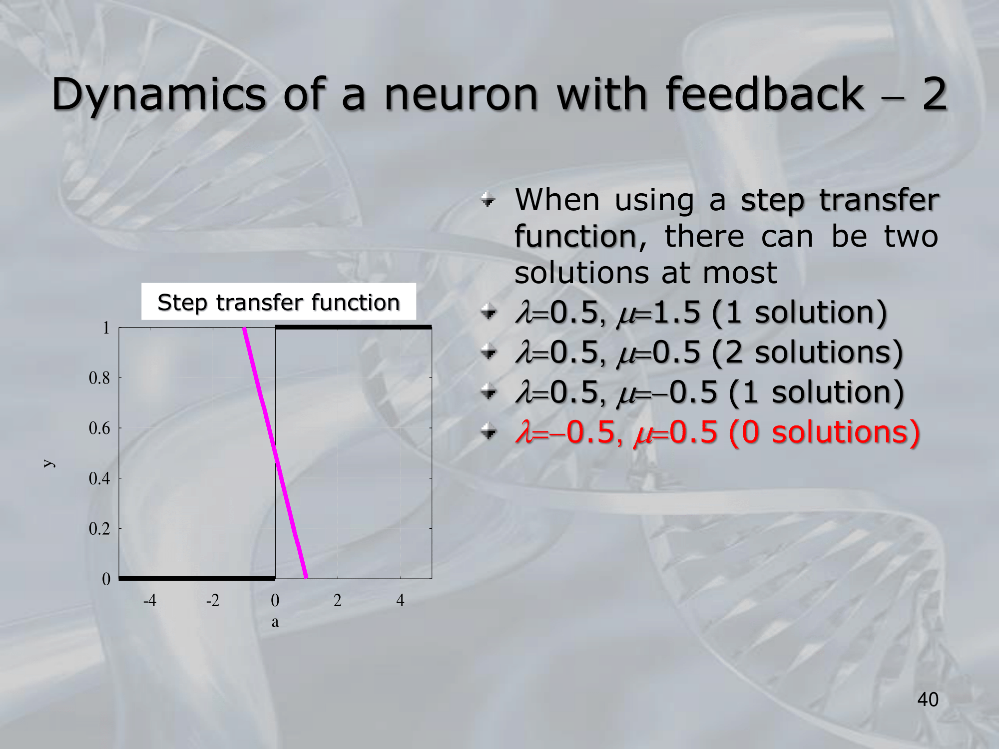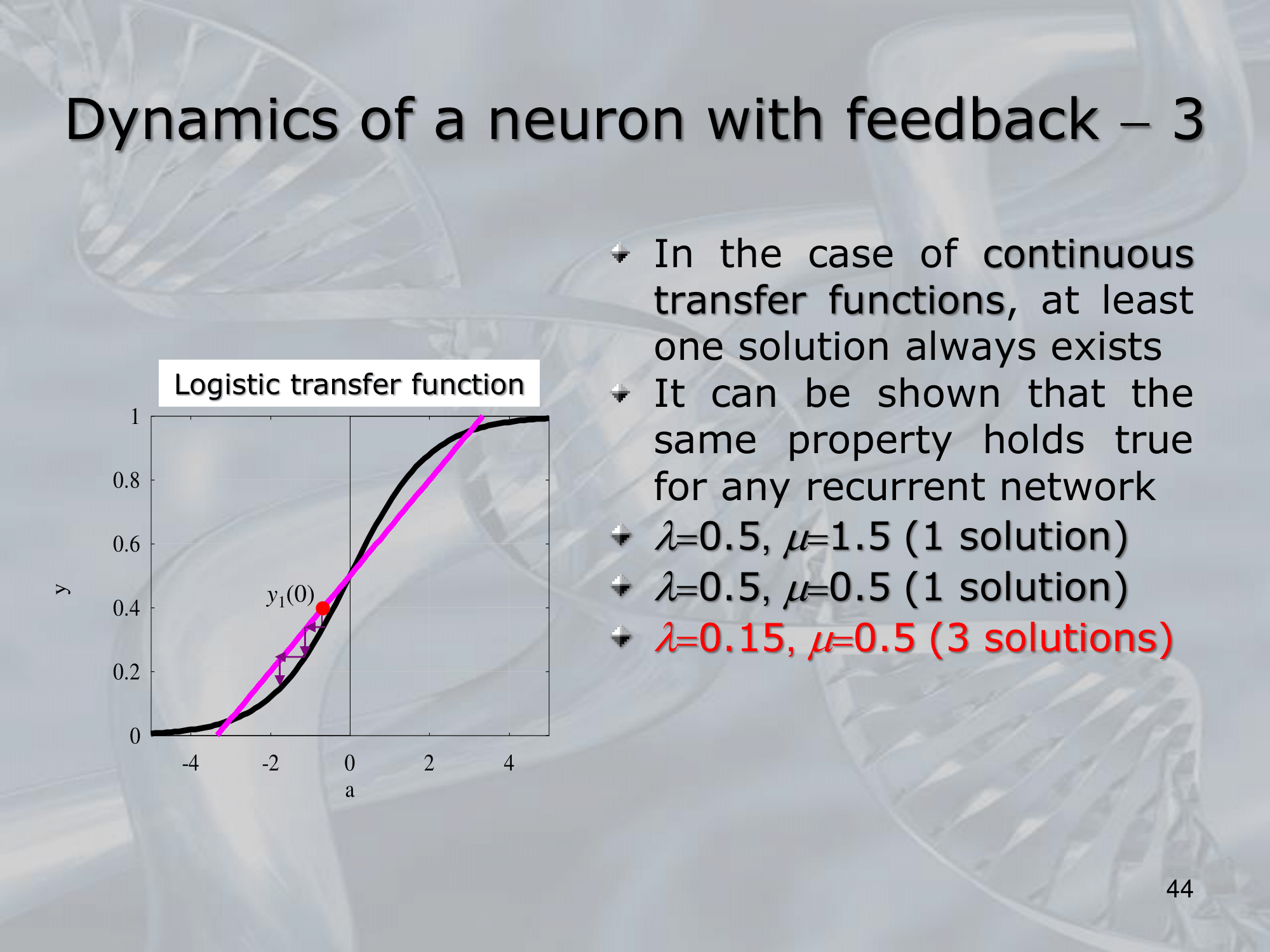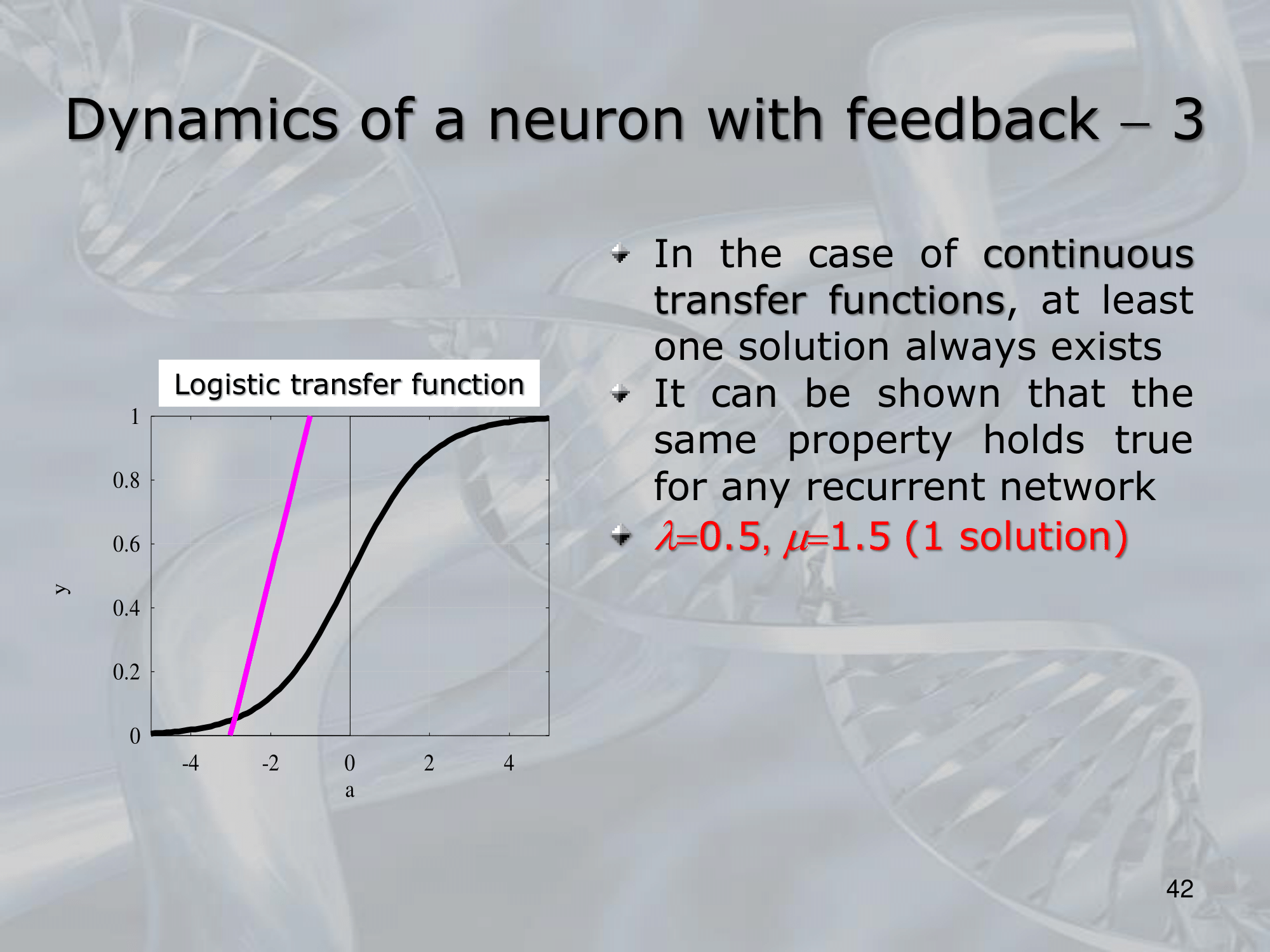 NOTE: As we can see this is an example on how the neuron with feedback founds a solution if it exists, in this case 3 solution exist, and the final result depends on the initial value . Formally this is the example of information latching.