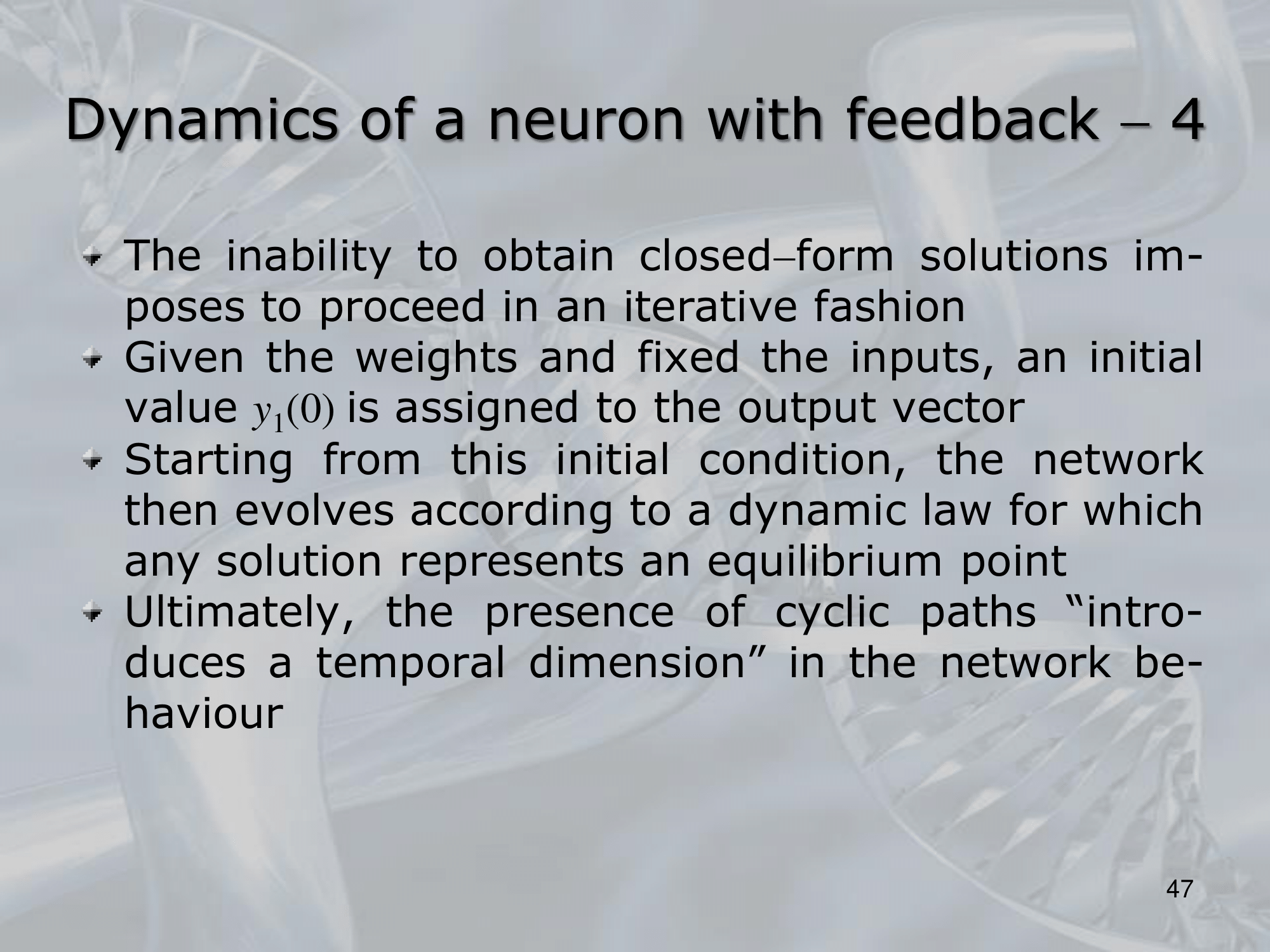 This is because the networkâs internal state can store information over multiple time steps, allowing it to remember previous inputs and use this information to inform its processing of the current input. - Overall, the dynamics of a neural network with feedback are highly dependent on the specific architecture and parameters of the network, as well as the nature of the input sequence.