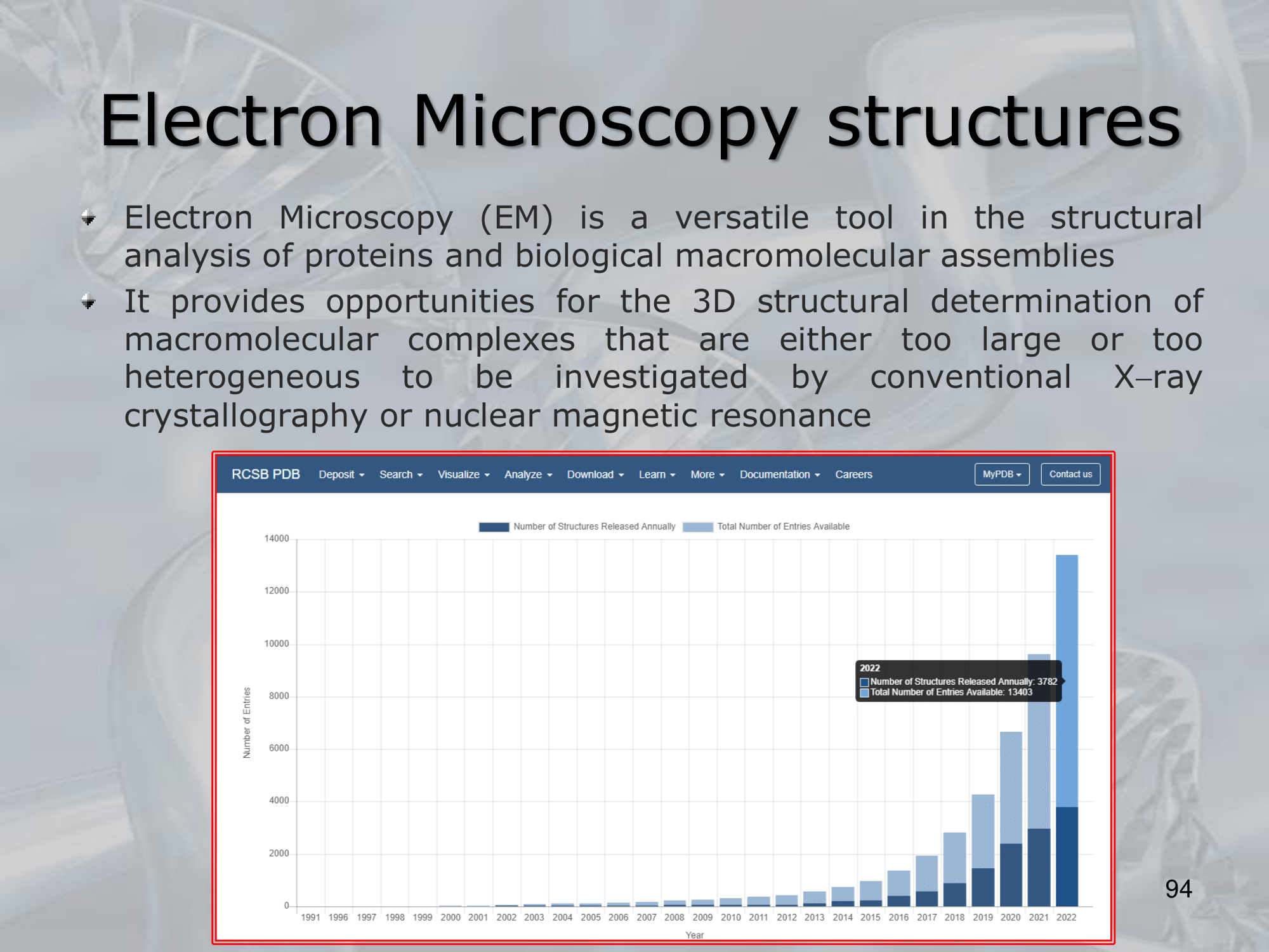 IMPORTANTE Electron Microscopy Structures See directly the molecules of the protein Itâs a new and powerful tool that can also see those proteins that the x-ray crystallography cannot, which are proteins either too large or too heterogeneus to be investigated by conventional X-ray cystallography or NMR (Nuclear Magnetic Resonance). It still costs a lot.