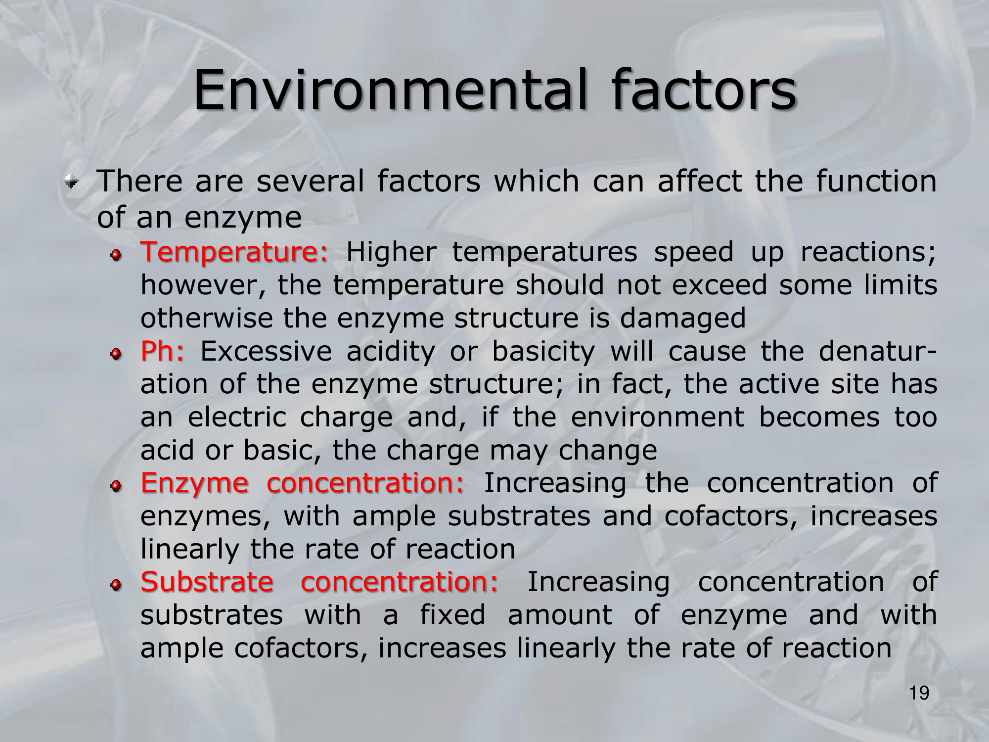 IMPORTANTE Factors that can alter the function of an Enzyme: Temperature: higher temperature speeds up reaction (there are limits) pH: an enzyme has a certain pH it need to be in, an higher or lower pH will deneurize the enzyme, making it useless. Enzyme Concentration: Increasing an enzyme concentration will increse linearly its products. Substrate Concentration: Increasing a substrate concentration will increse linearly its products.