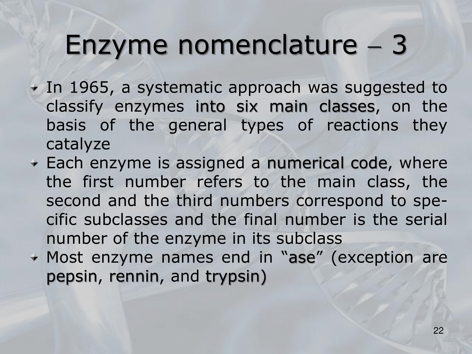 IMPORTANTE Enzyme Nomenclature: most enzyme names end in â-aseâ The exceptions are: pepsin, rennin, trypsin.