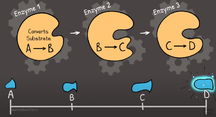Once we have enough D product we would like to stop this chain, to do this the enzyme 1 might have aa an inhibitor the product D, once enough D product are done, some will be used to stop the chain inhibiting the first enzyme.