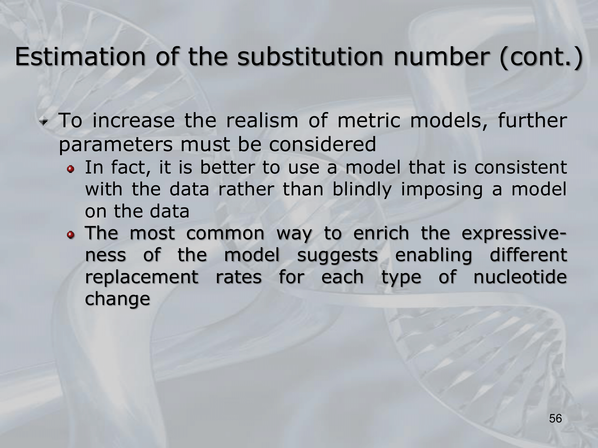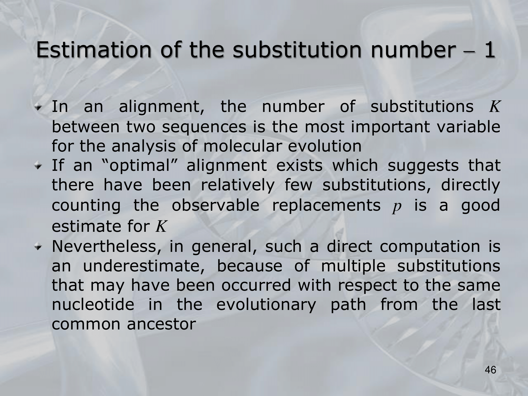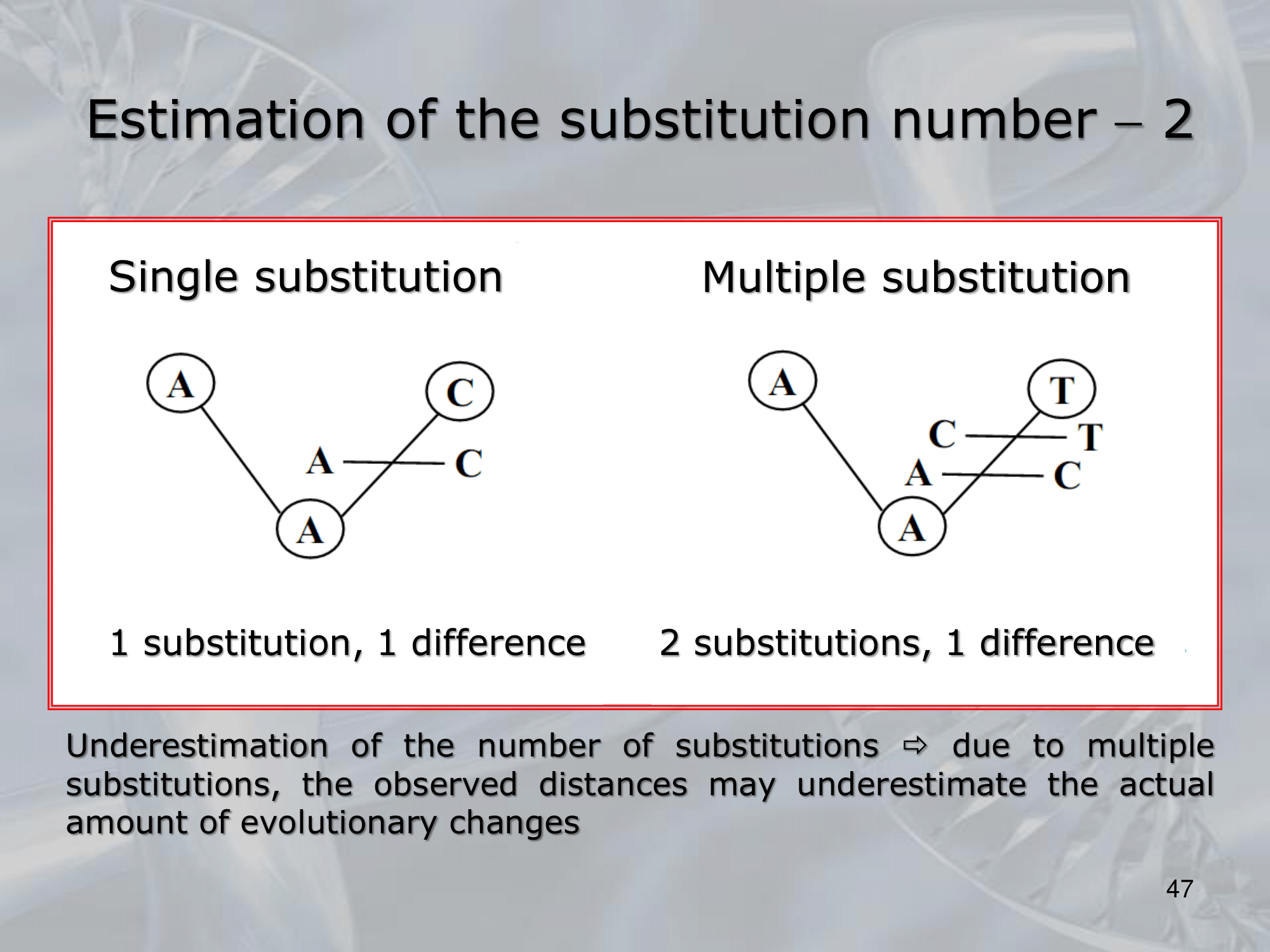 - The substitution number, or the number of substitutions that have occurred between two DNA or protein sequences, can be estimated using various methods in molecular evolution, such as maximum likelihood, Bayesian inference, and parsimony methods.
