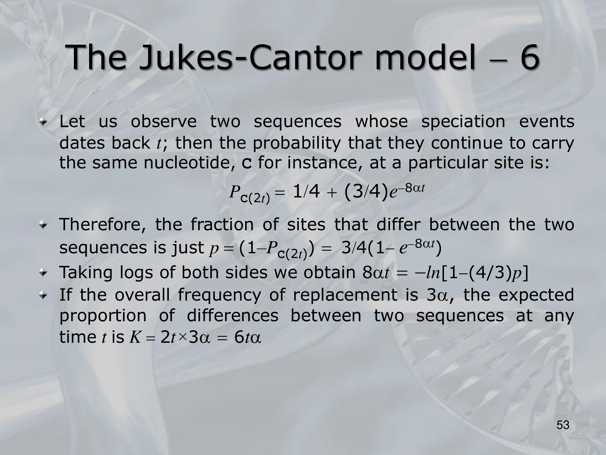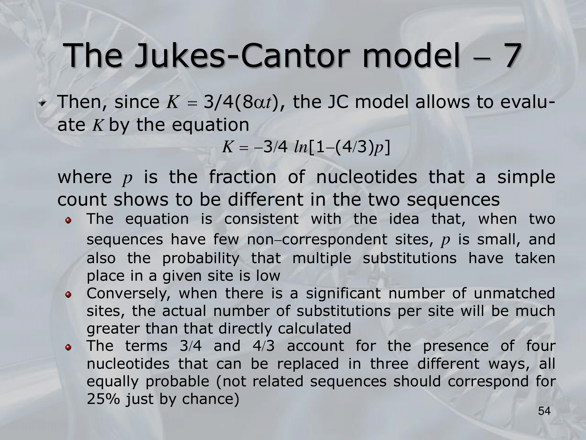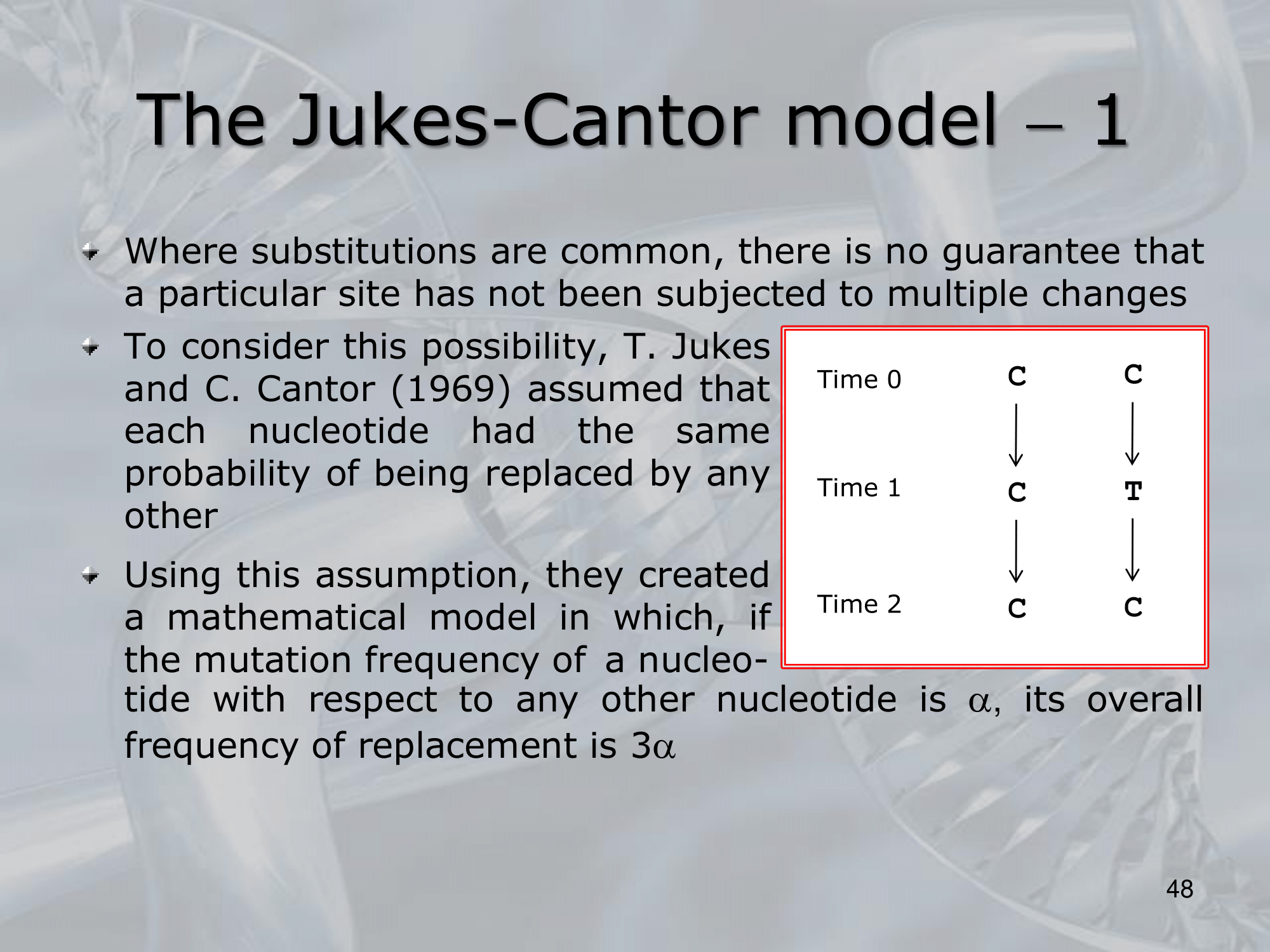- The James-Cantor model is a probabilistic model that calculates the expected number of substitutions between two DNA sequences over a given time period. The basic assumptions of the model are that the substitution rates are equal among sites in the sequence and that each site evolves independently. The model also assumes that the nucleotide frequencies are constant over time and that all substitutions are equally likely.