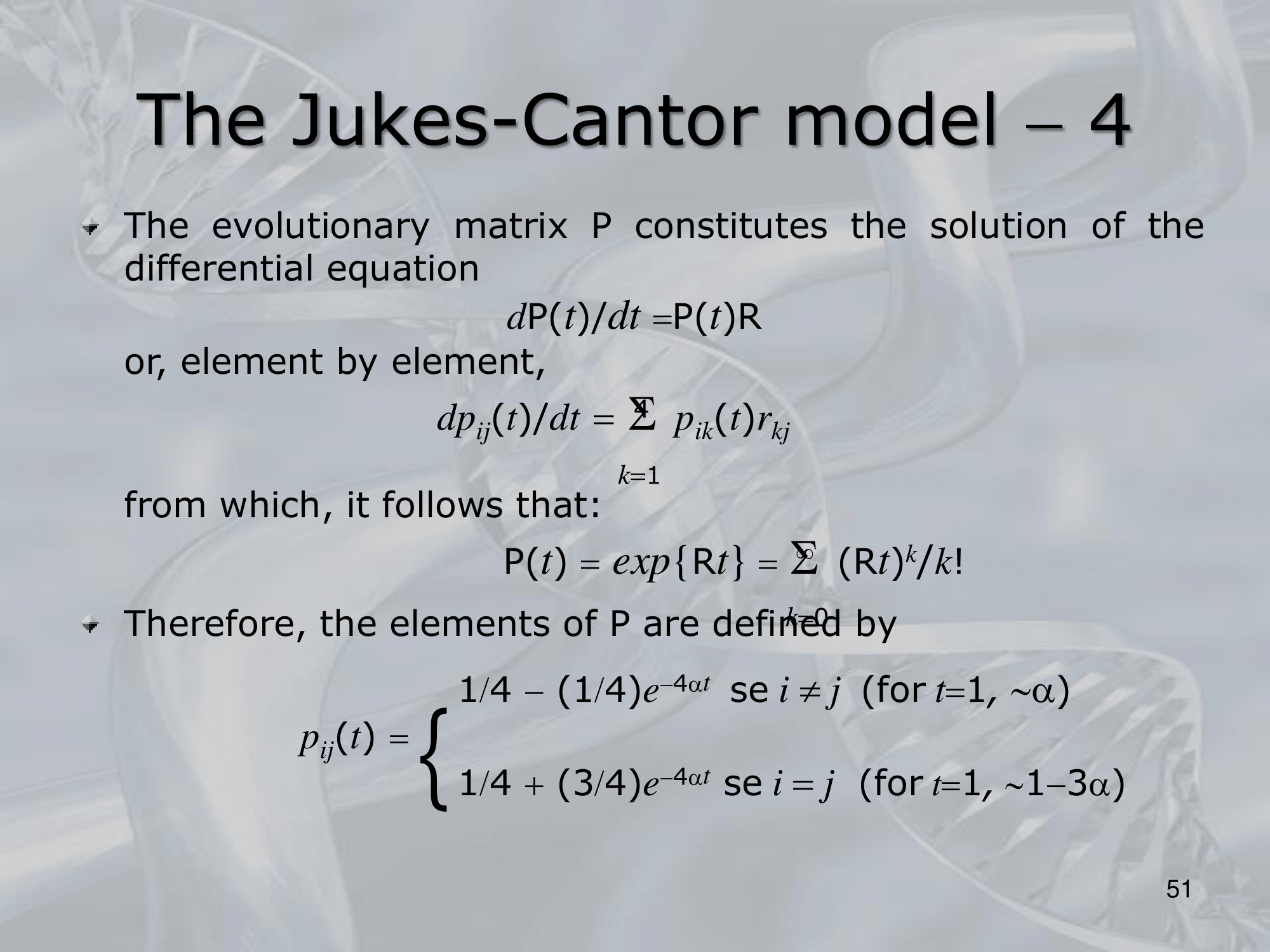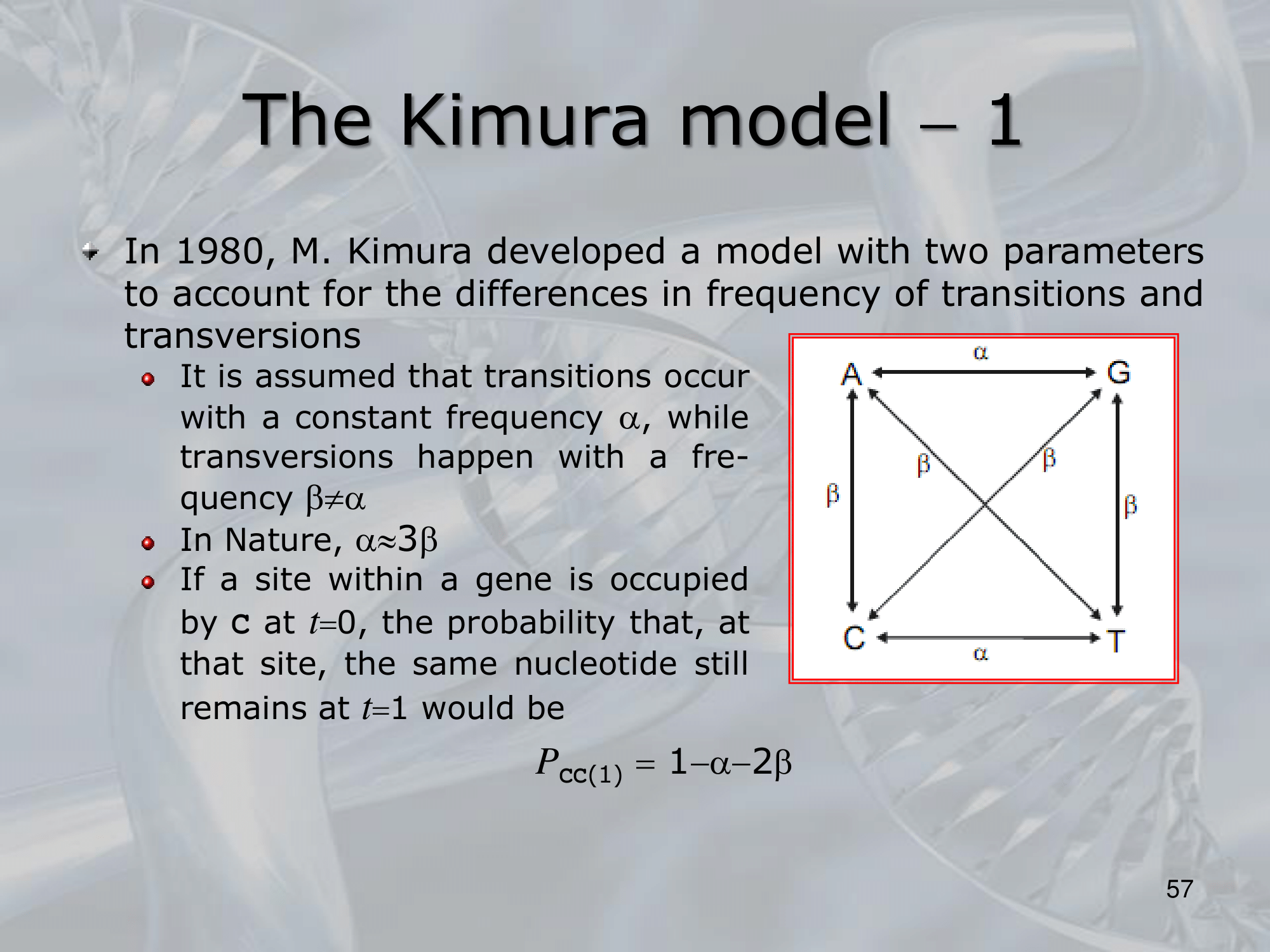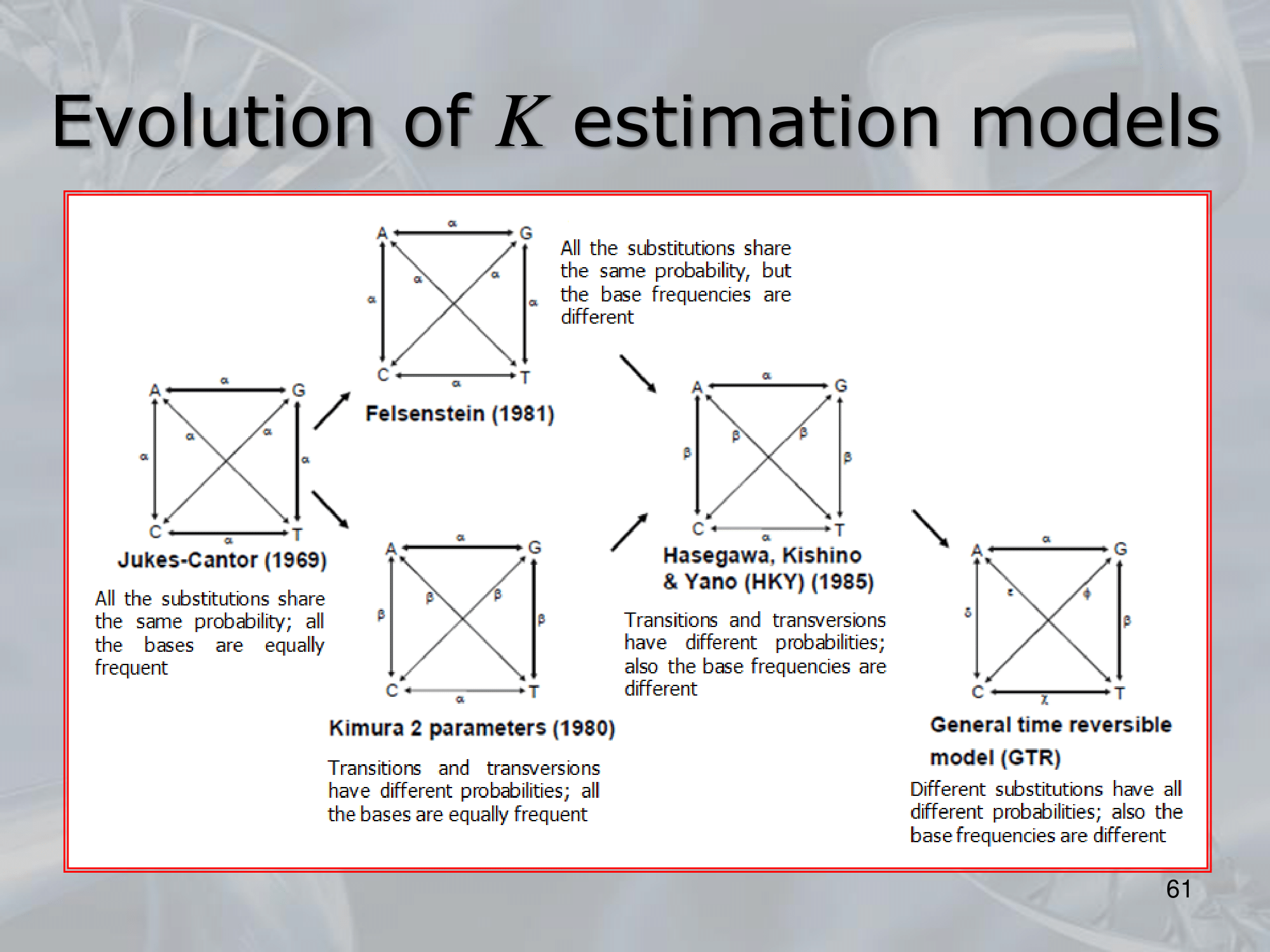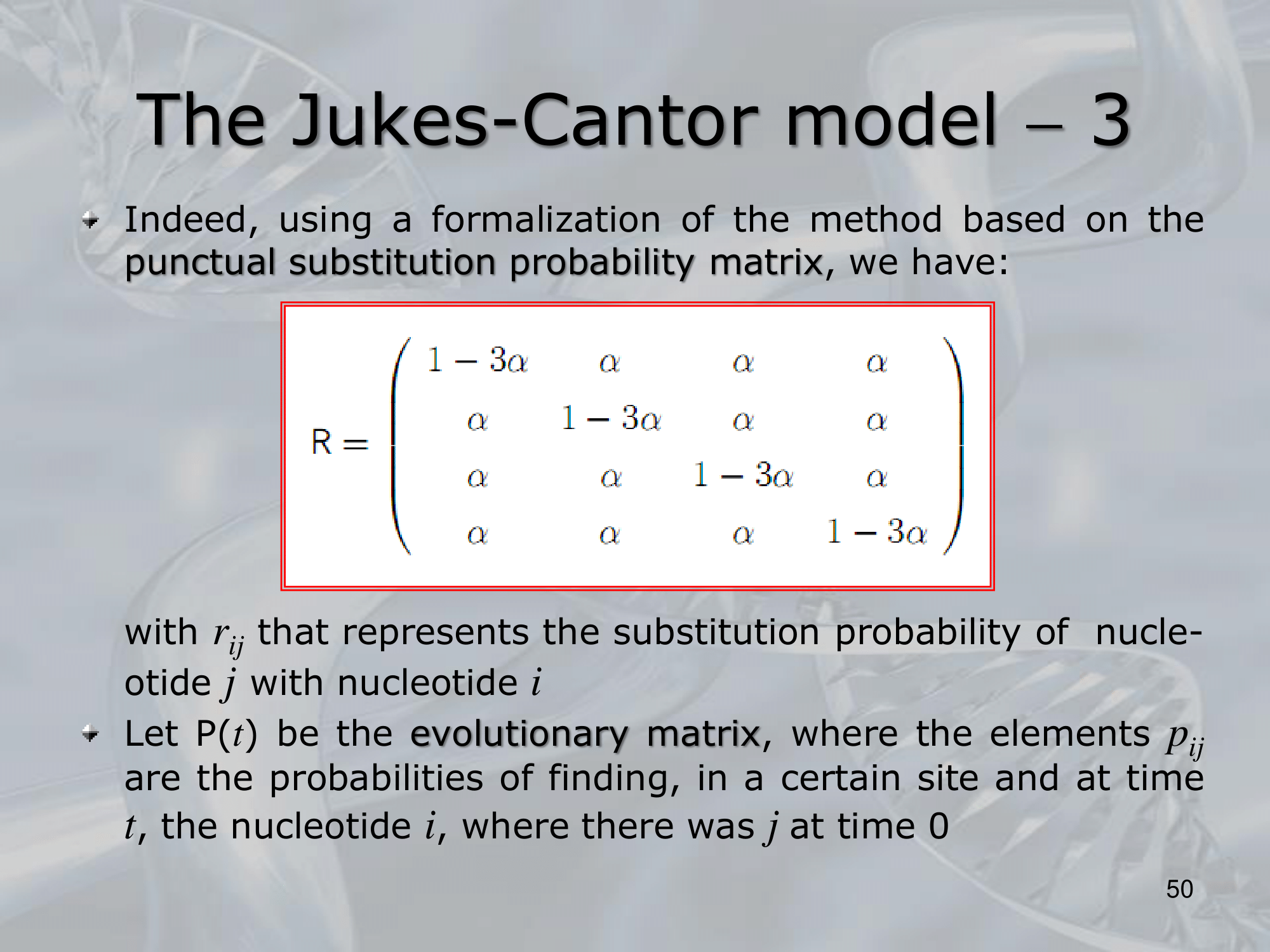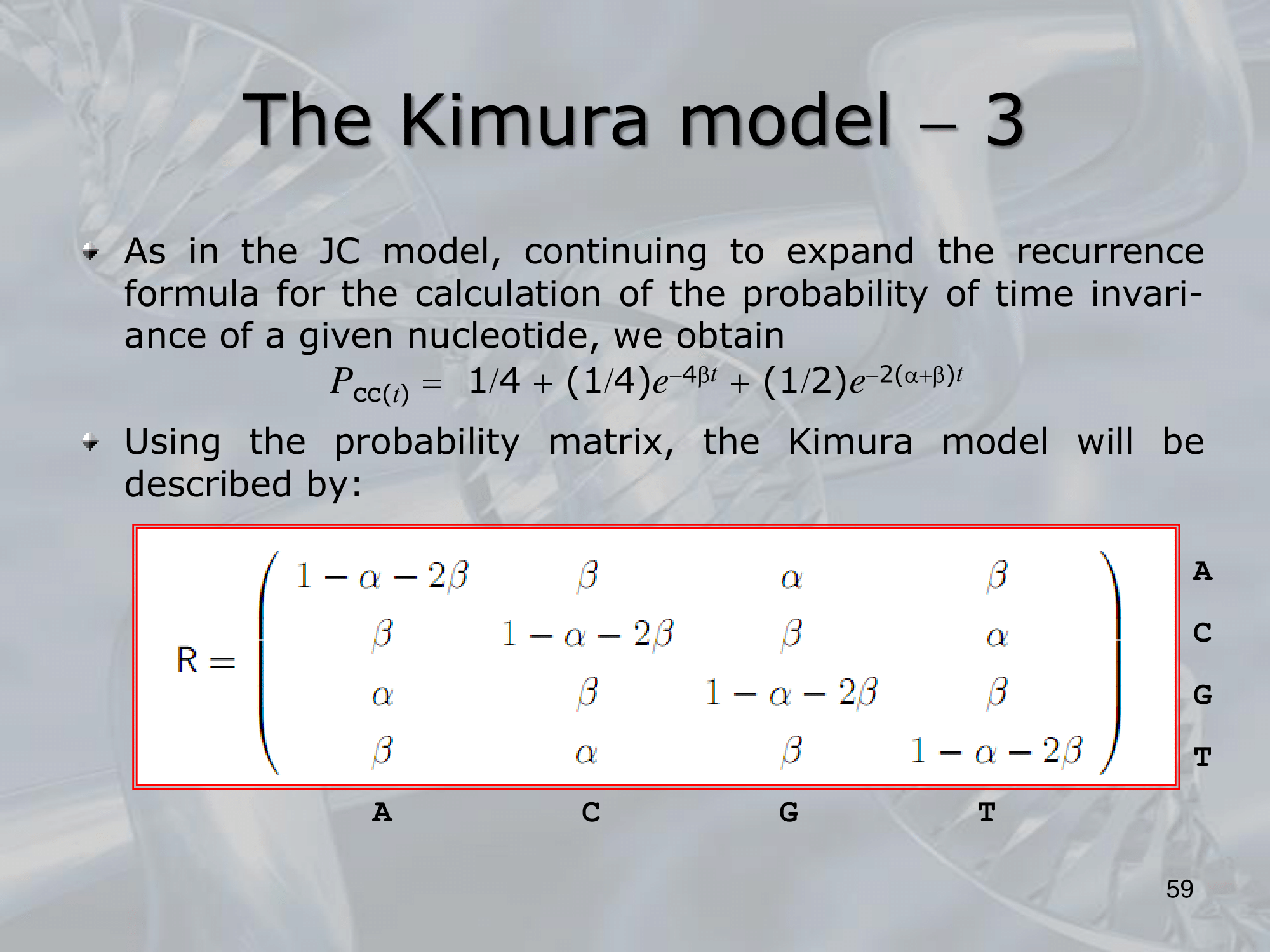 - The model is based on the use of a rate matrix, which describes the probability of a nucleotide substitution from one base to another. The rate matrix is defined as follows:
