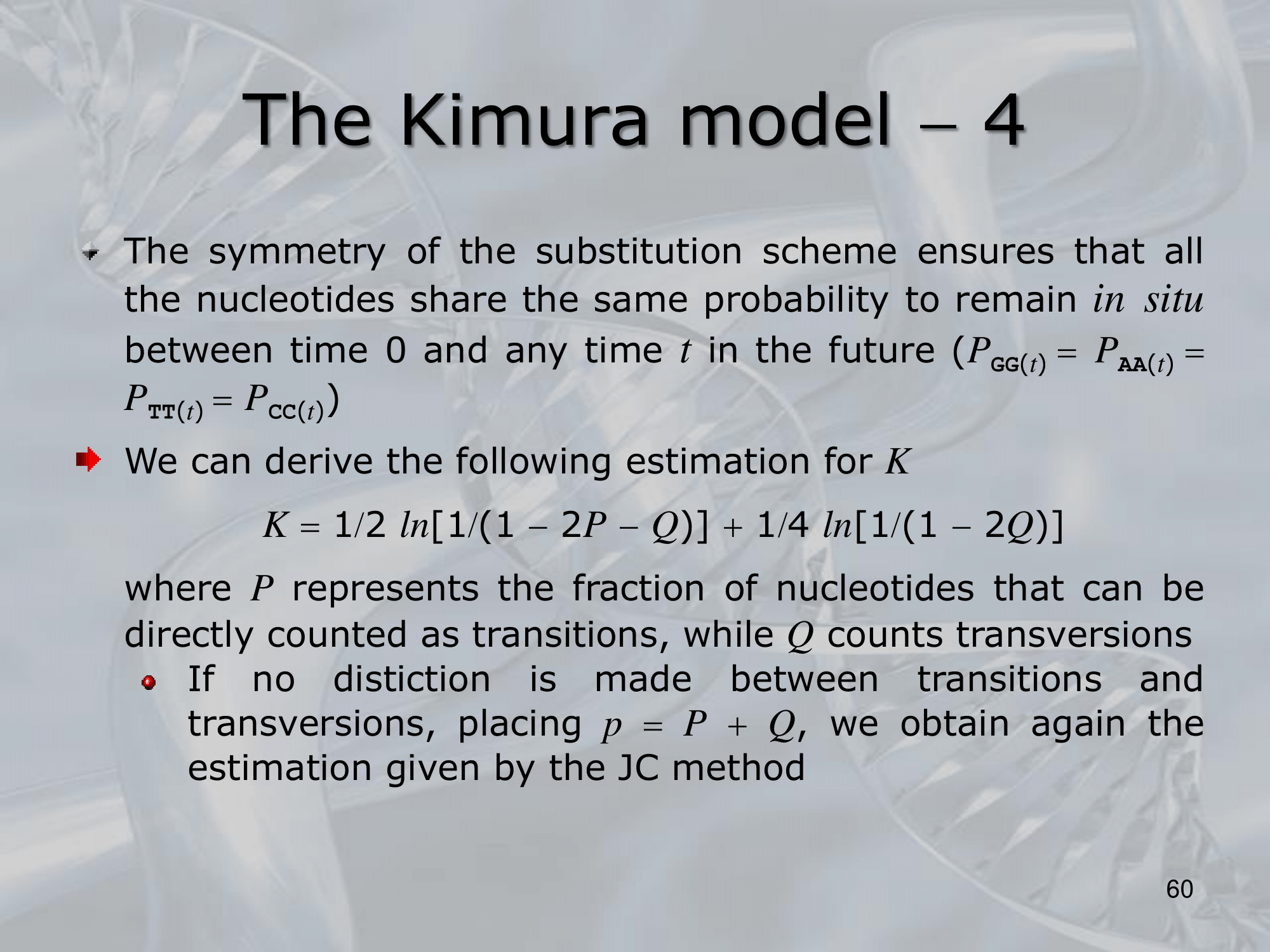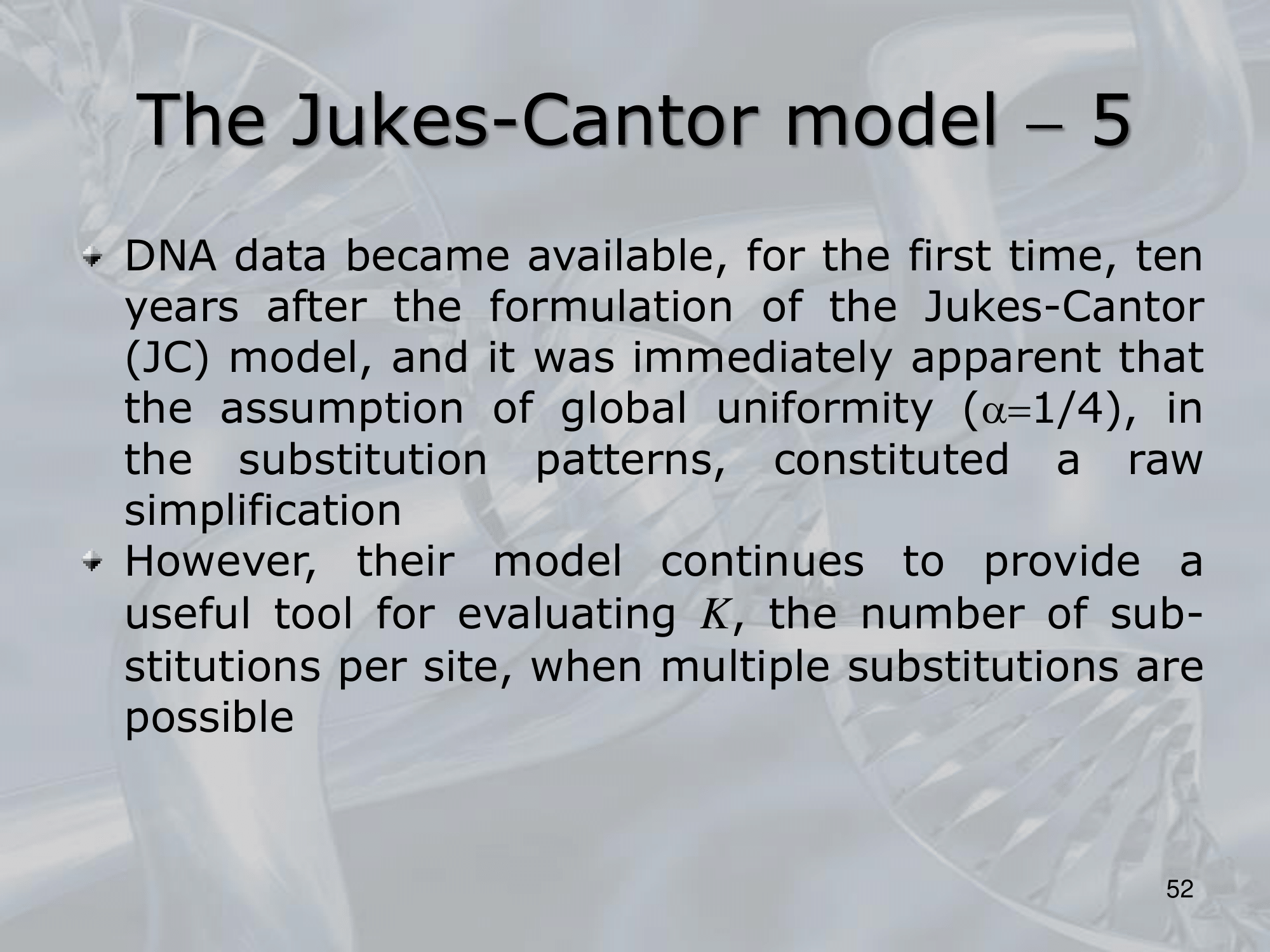 - The original James-Cantor Model assumed that nucleotide substitutions occurred independently at each site in the DNA sequence, and that all four nucleotides had equal probability of being substituted.