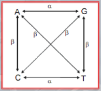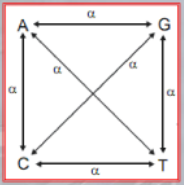 Se sostituiamo una Purina (G & A) con lâaltra purina, il rate di sostituzione Ăš , lo stesso se sostituiamo una Pirimidina (C & T) con lâaltra pirimidina. Al contrario se passiamo da purina a pirimidina o viceversa, il rate di sostituzione diventa (piĂč improbabile).