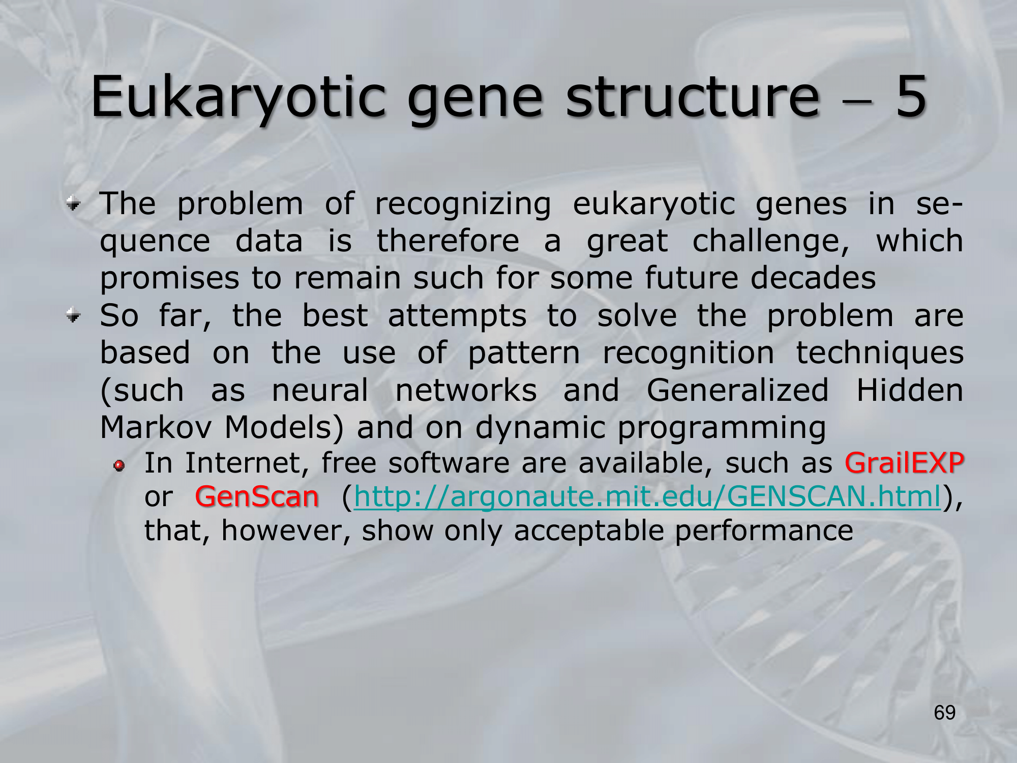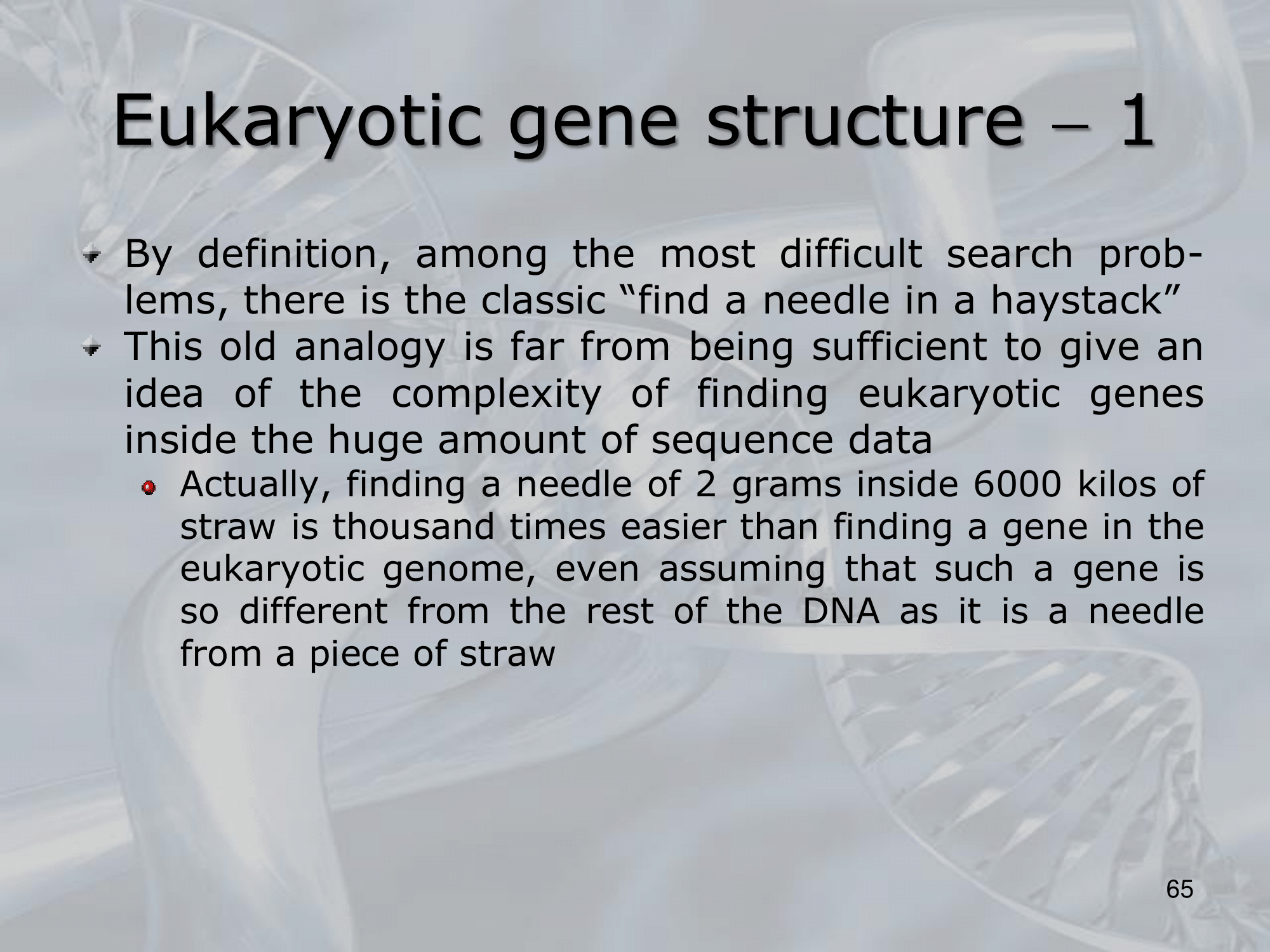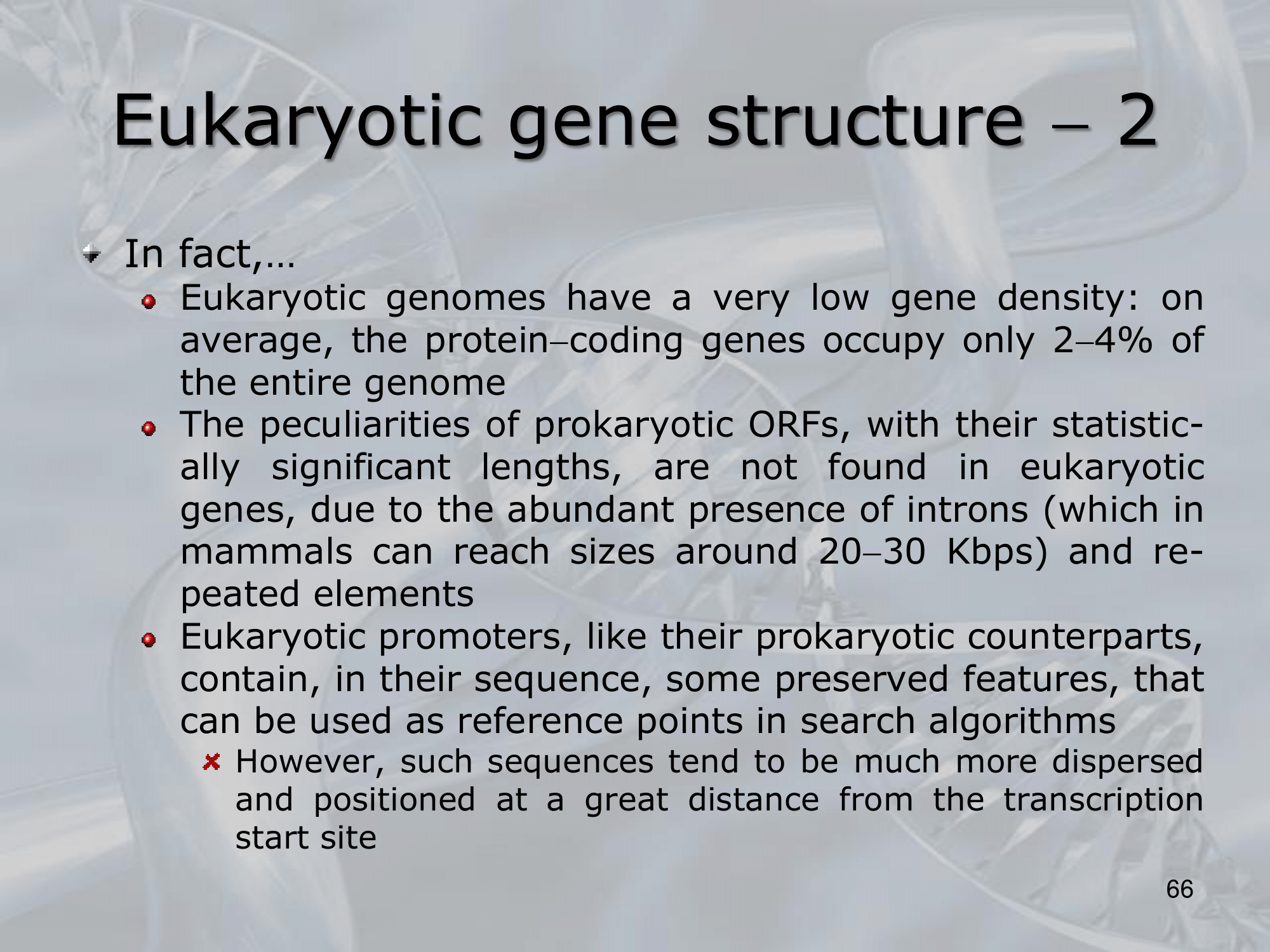 IMPORTANTE Eukaryote have very low gene density: 2~4%. #IMPORTANTE Eukaryotes do have an ubundant presence of introns and repeated elements, that makes finding a gene very difficult (even for pattern recognizing software) What are Introns? #IMPORTANTE