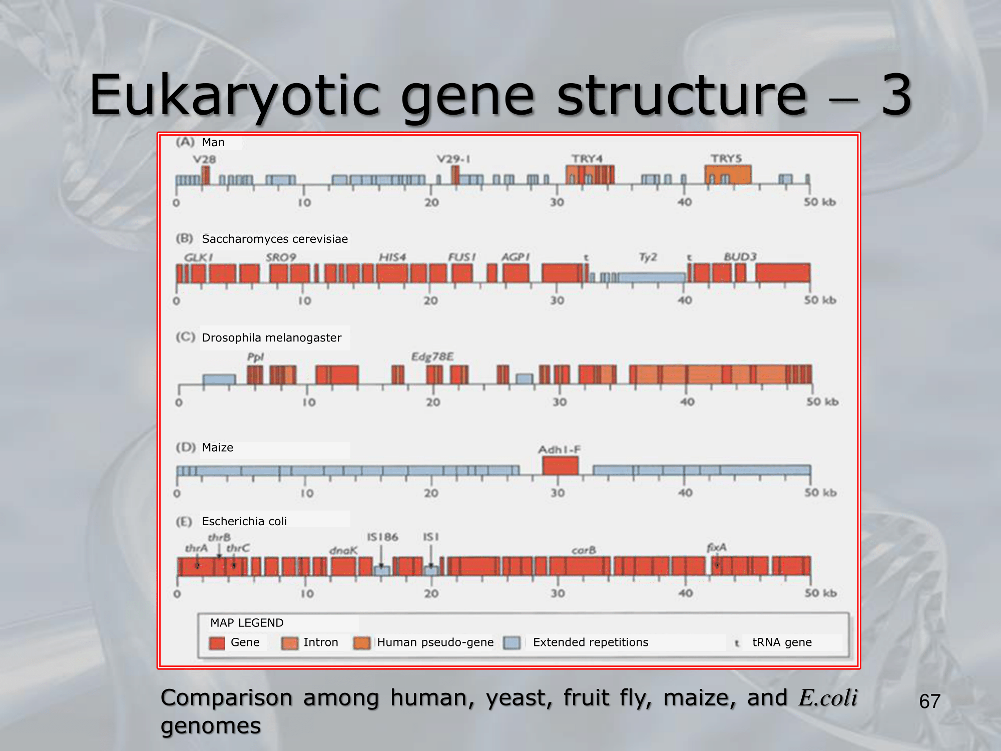 - ==The gene structure of eukaryotes is characterized by several distinct features, including the presence of introns, the use of alternative splicing, and the regulation of gene expression by cis- and trans-acting factors==.