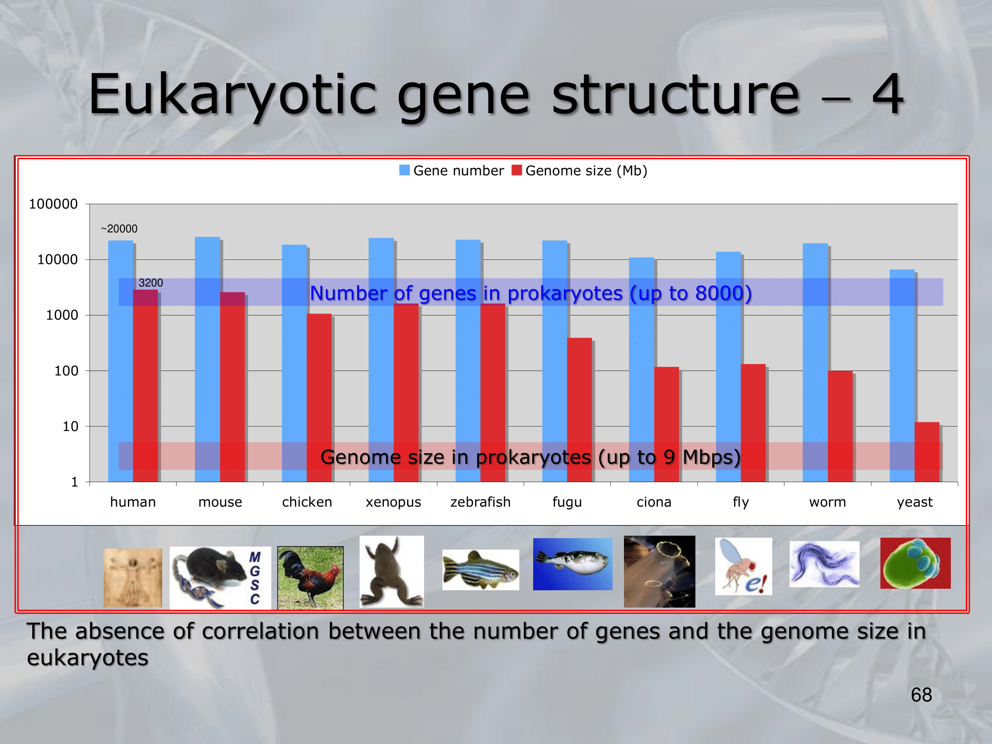 IMPORTANTE Eukaryote have very low gene density: 2~4%. #IMPORTANTE Eukaryptes do have an ubundant introns inside their ORFs (Open Reading Frames)TODO What are introns? #IMPORTANTE