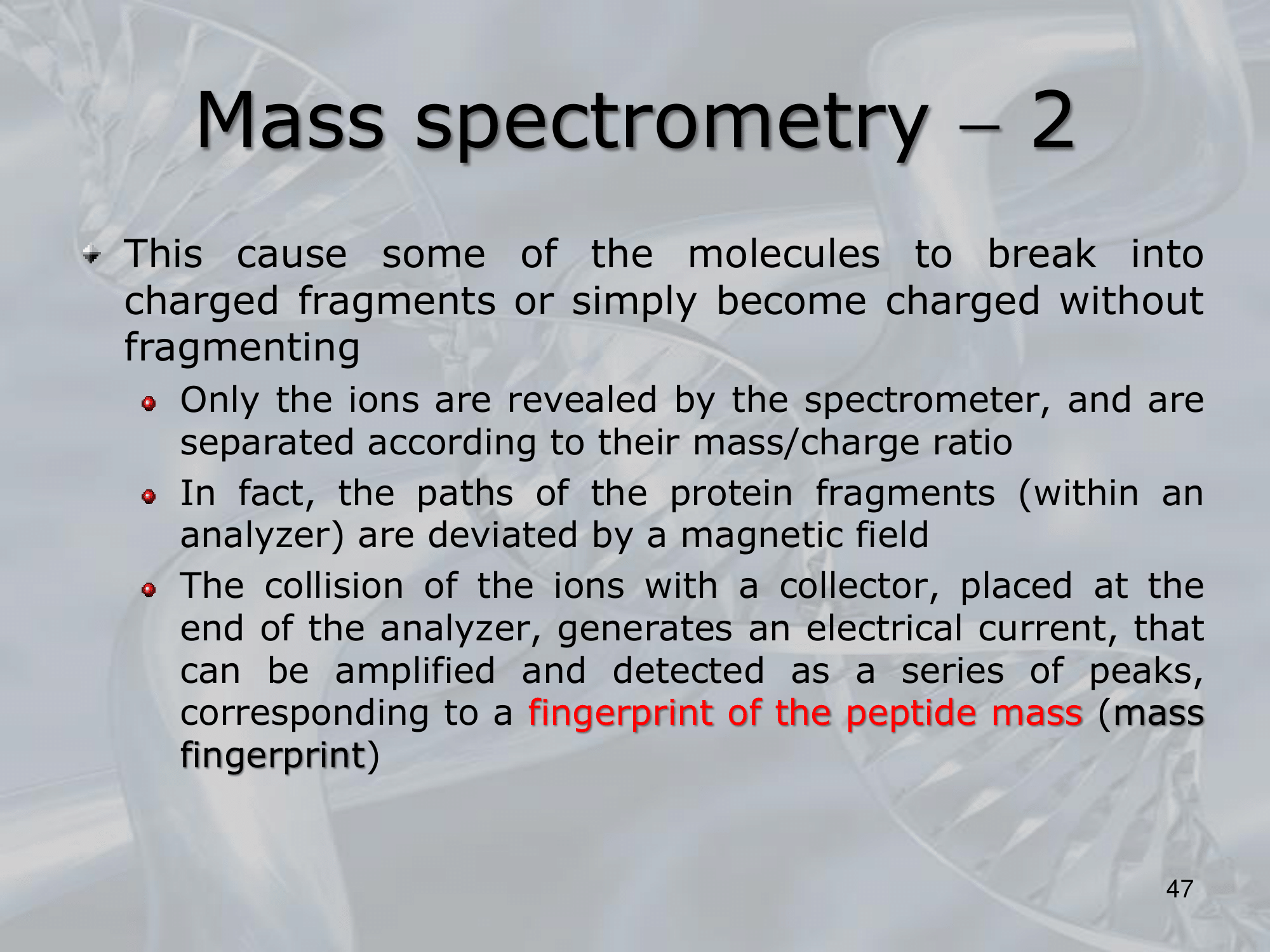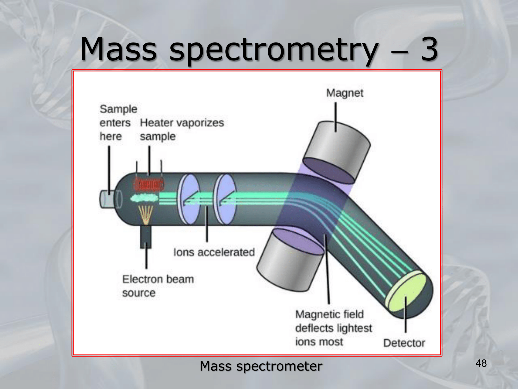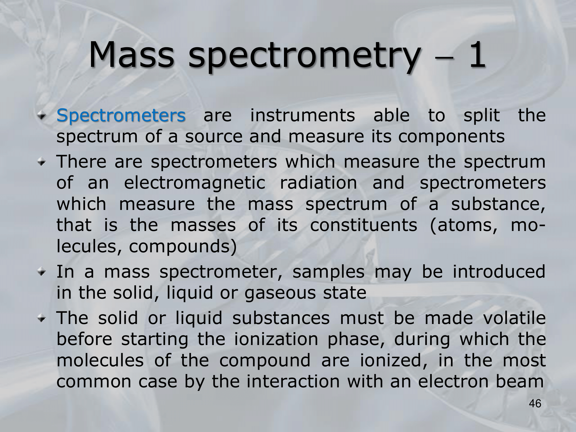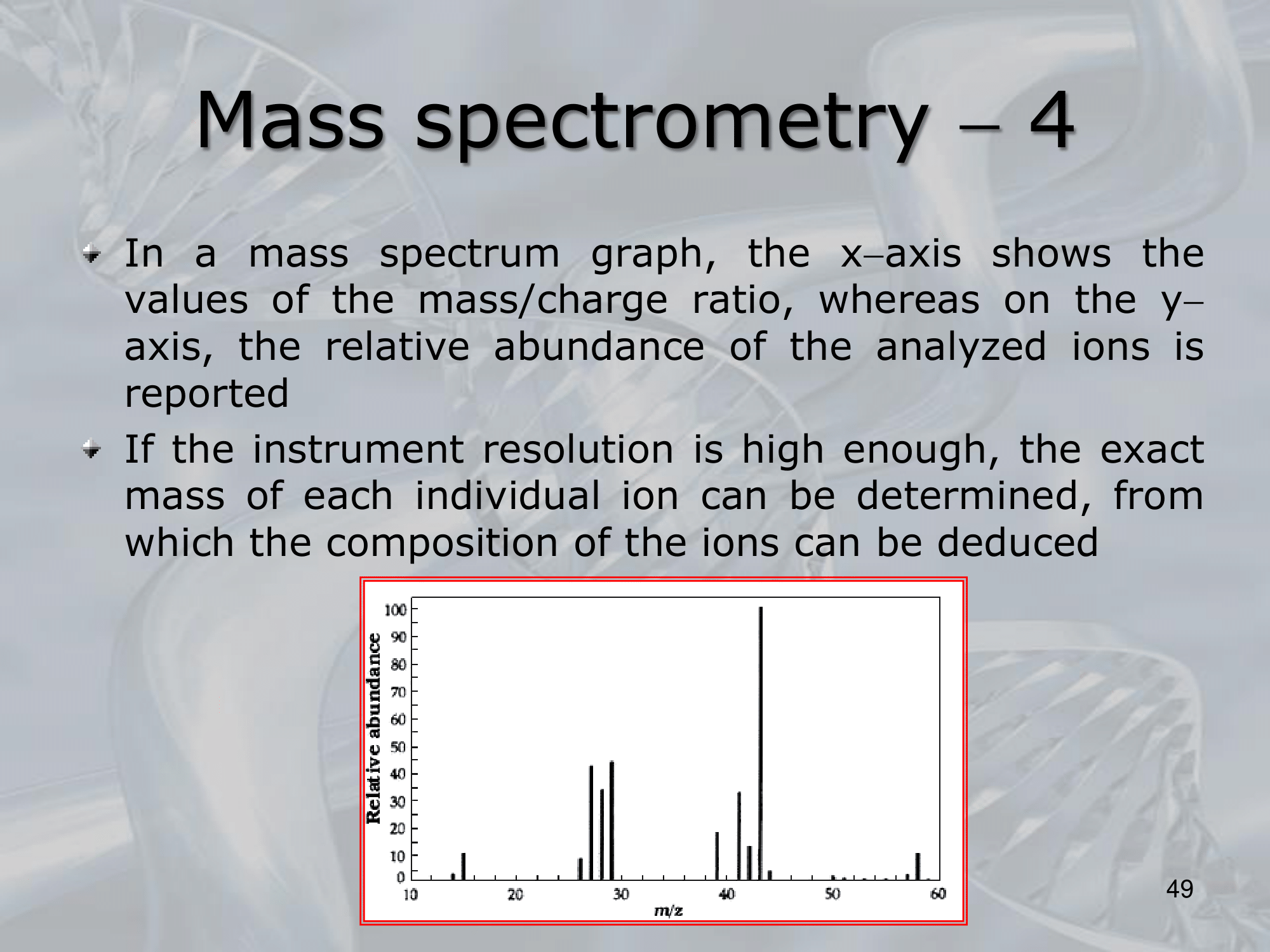• The basic principle of MS involves ionizing a molecule and then separating and detecting the resulting ions based on their mass-to-charge ratio.