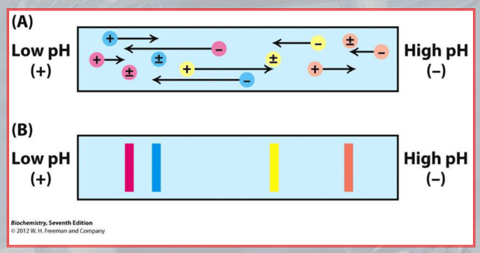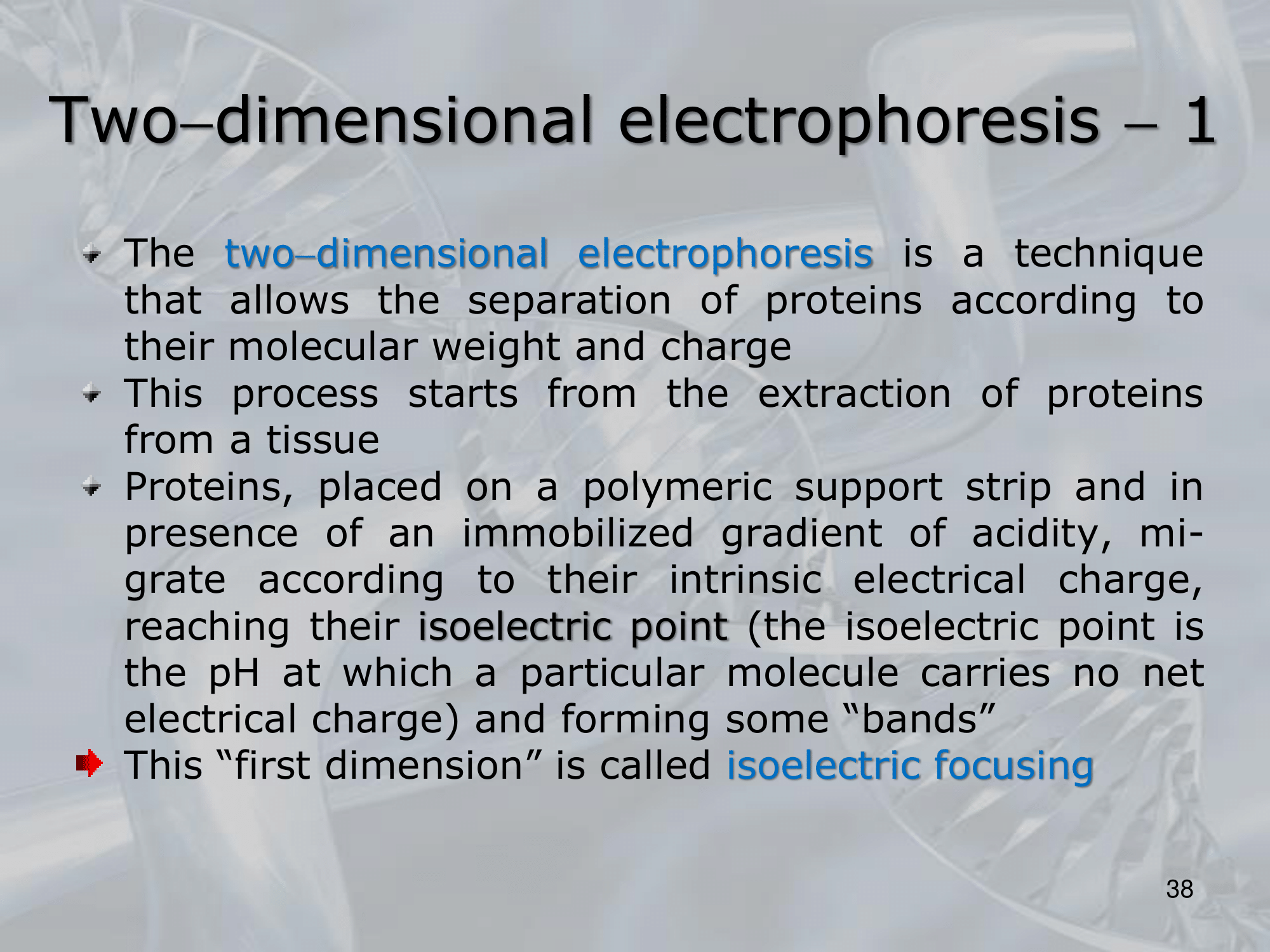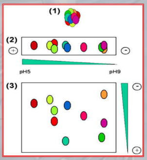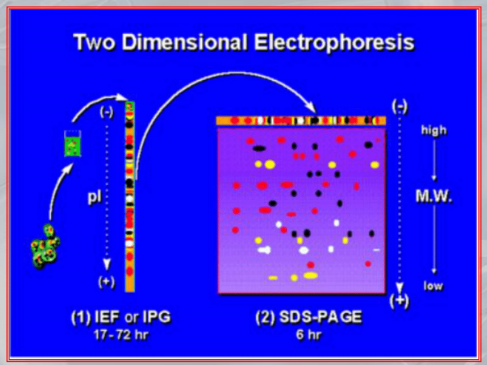 IMPORTANTE Two-Dimensional Electrophoresis: Allows the separation of proteins according to their molecular weight and charge. #IMPORTANTE The “first dimension is called” isoelectric focusing, the proteins collected from a tissue are placed on a polymeric support strip and are immersed in an immobilazing gradient of acidity, the protein will then move according to their pH to reach what is called an ==isoelectric point, which is a value of the pH at which a particular molecule carries no net electical charge==
