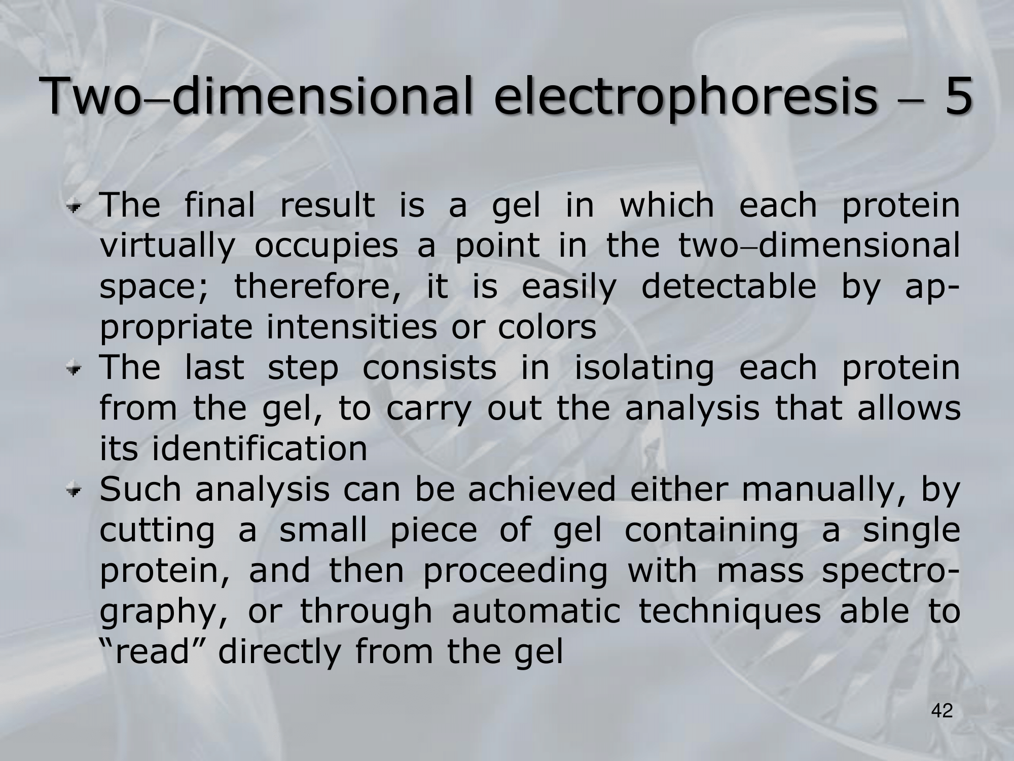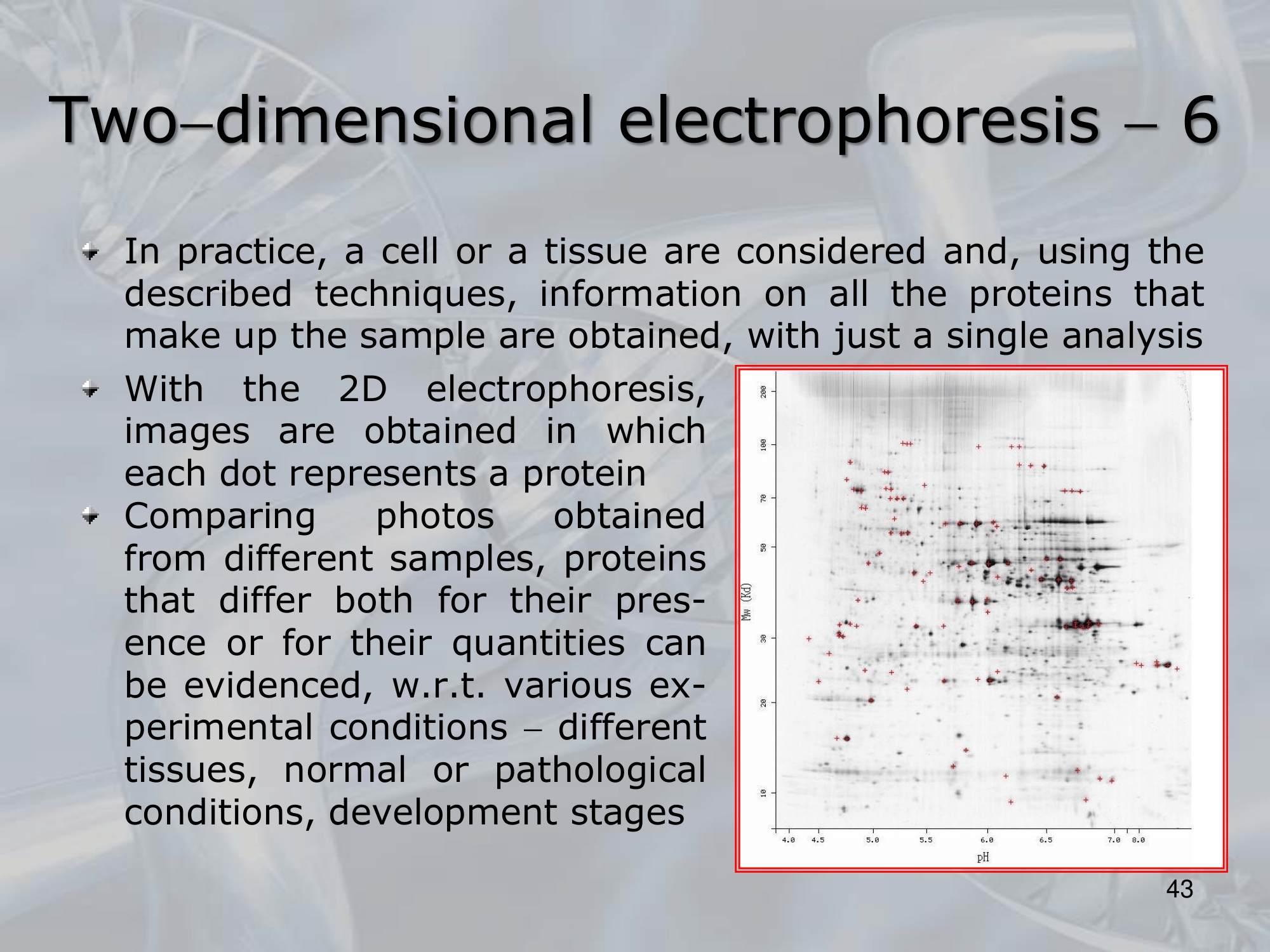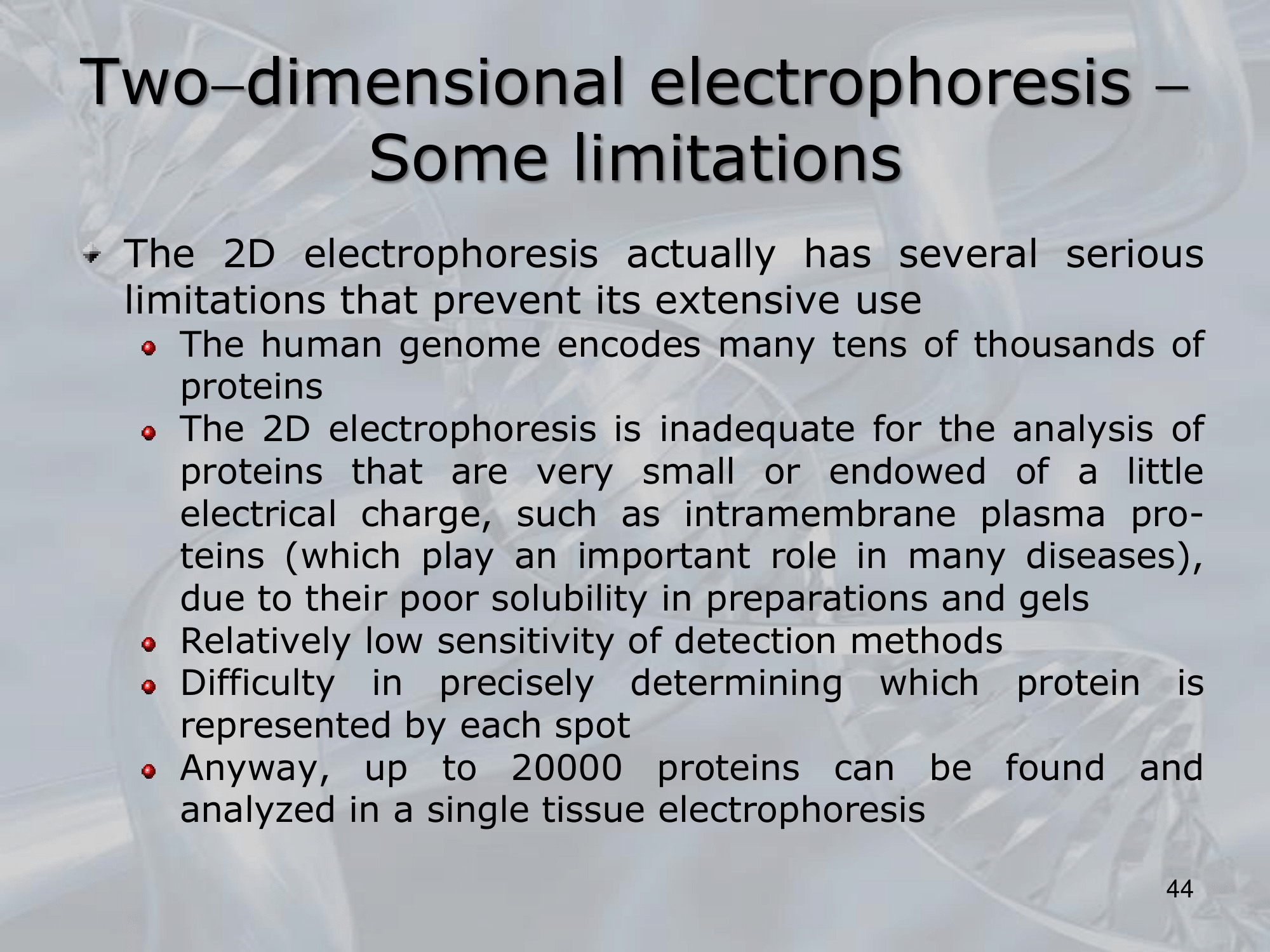 #IMPORTANTE The last step is that of isolating the protein we are intrested in, either manually or we study it directly on the gel. Also we can study the resulting image of the elecrophoresis, seeing if a particular tissue either sane, diseased or treated (with respect to the same tissue is a different situation -sane, diseased or treated-) have an abbundace, lack or presence of some proteins. #IMPORTANTE There are some limitiation to this method. Mainly the diffuclty of identifing each protein at each dot (the human genome encodes many tens of thousands of proteins). Also the 2D electrophoresis is inadequate for the analysis of proteins that are very small or endowed with a little electric charge, but unluckly these proteins play an important role in many diseases. #IMPORTANTE It has some limitations but up to proteins can be found and analyzed in a singe tissue using this method.