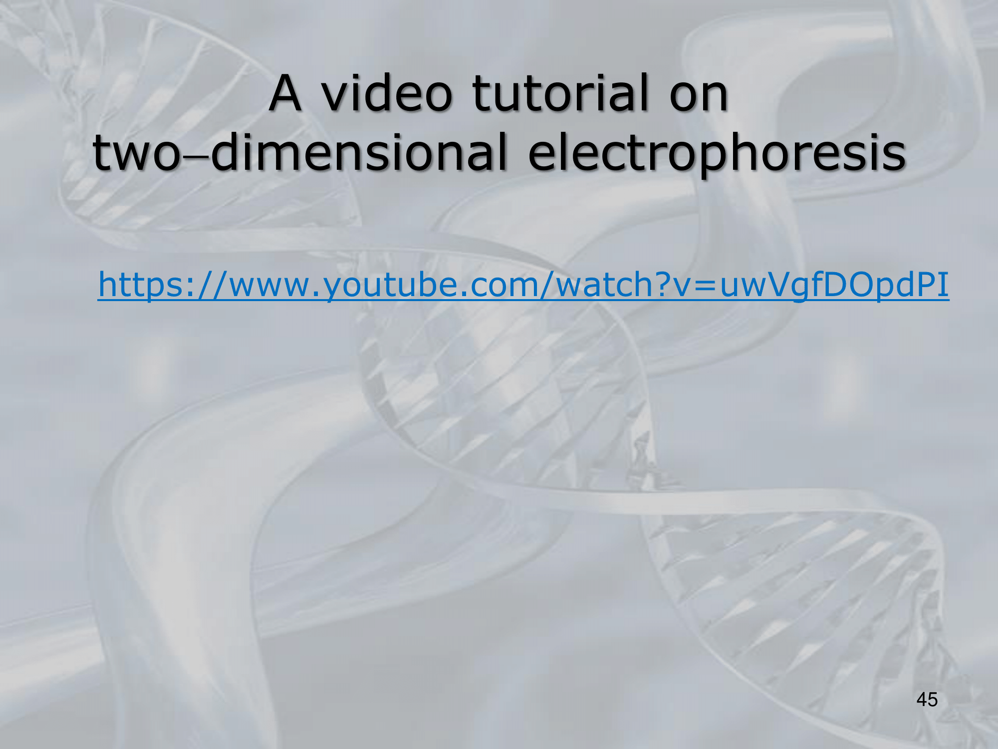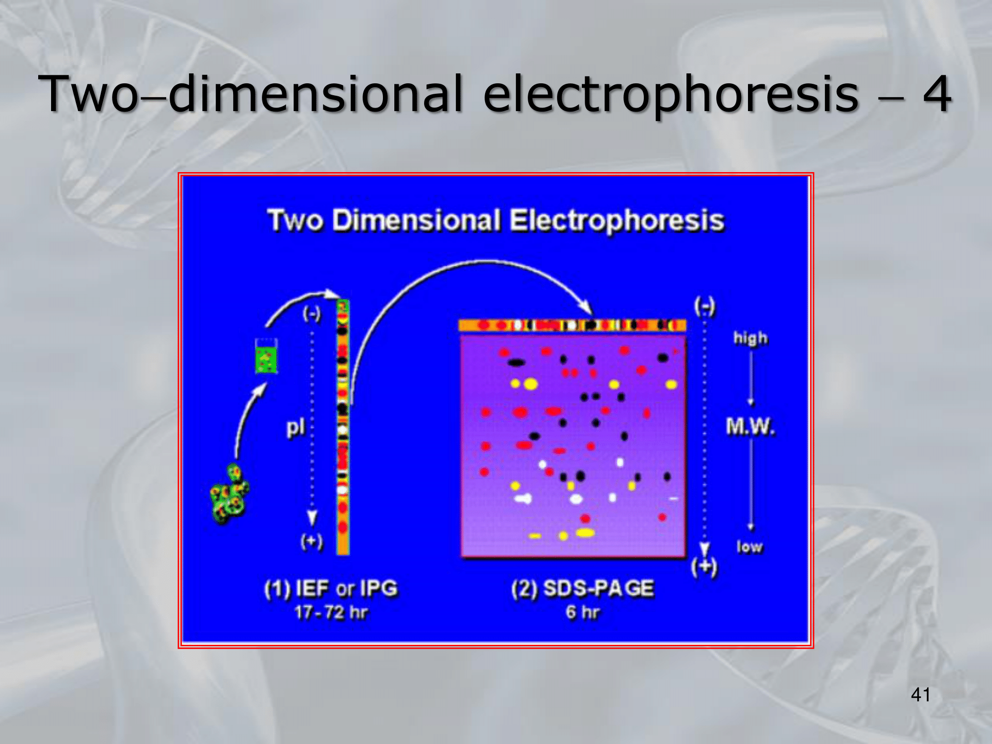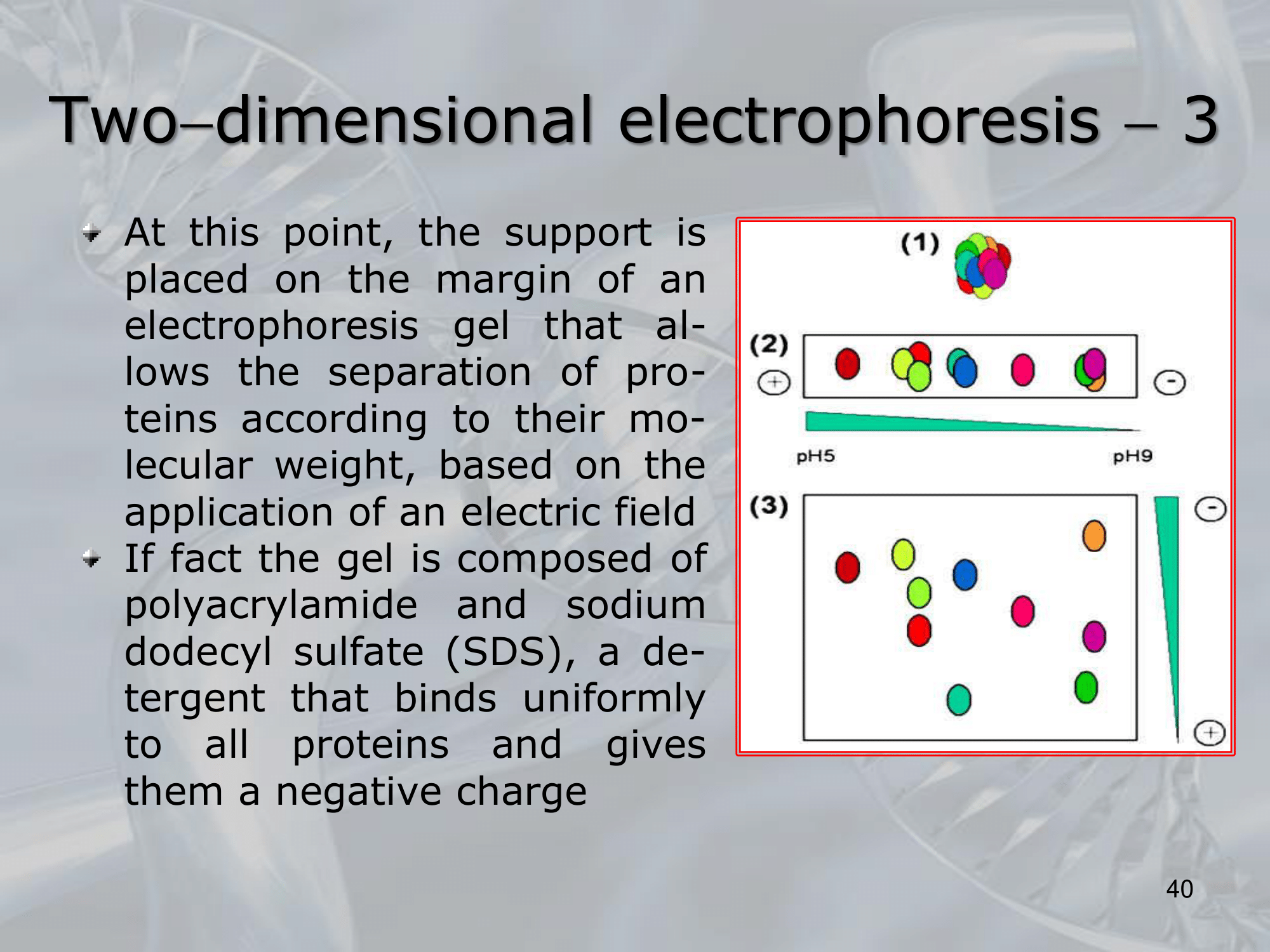 #IMPORTANTE The last step is that of isolating the protein we are intrested in, either manually or we study it directly on the gel. Also we can study the resulting image of the elecrophoresis, seeing if a particular tissue either sane, diseased or treated (with respect to the same tissue is a different situation -sane, diseased or treated-) have an abbundace, lack or presence of some proteins. #IMPORTANTE There are some limitiation to this method. Mainly the diffuclty of identifing each protein at each dot (the human genome encodes many tens of thousands of proteins). Also the 2D electrophoresis is inadequate for the analysis of proteins that are very small or endowed with a little electric charge, but unluckly these proteins play an important role in many diseases. #IMPORTANTE It has some limitations but up to proteins can be found and analyzed in a singe tissue using this method.