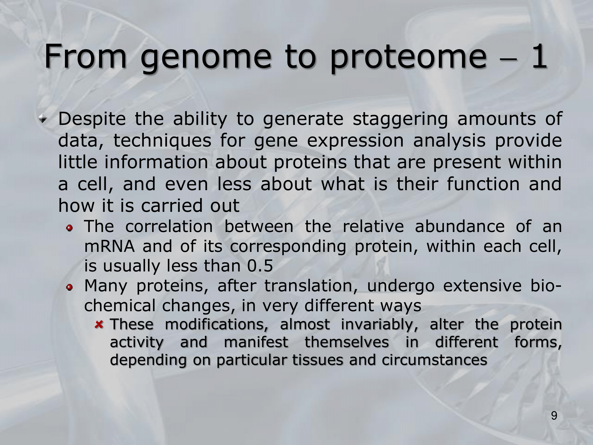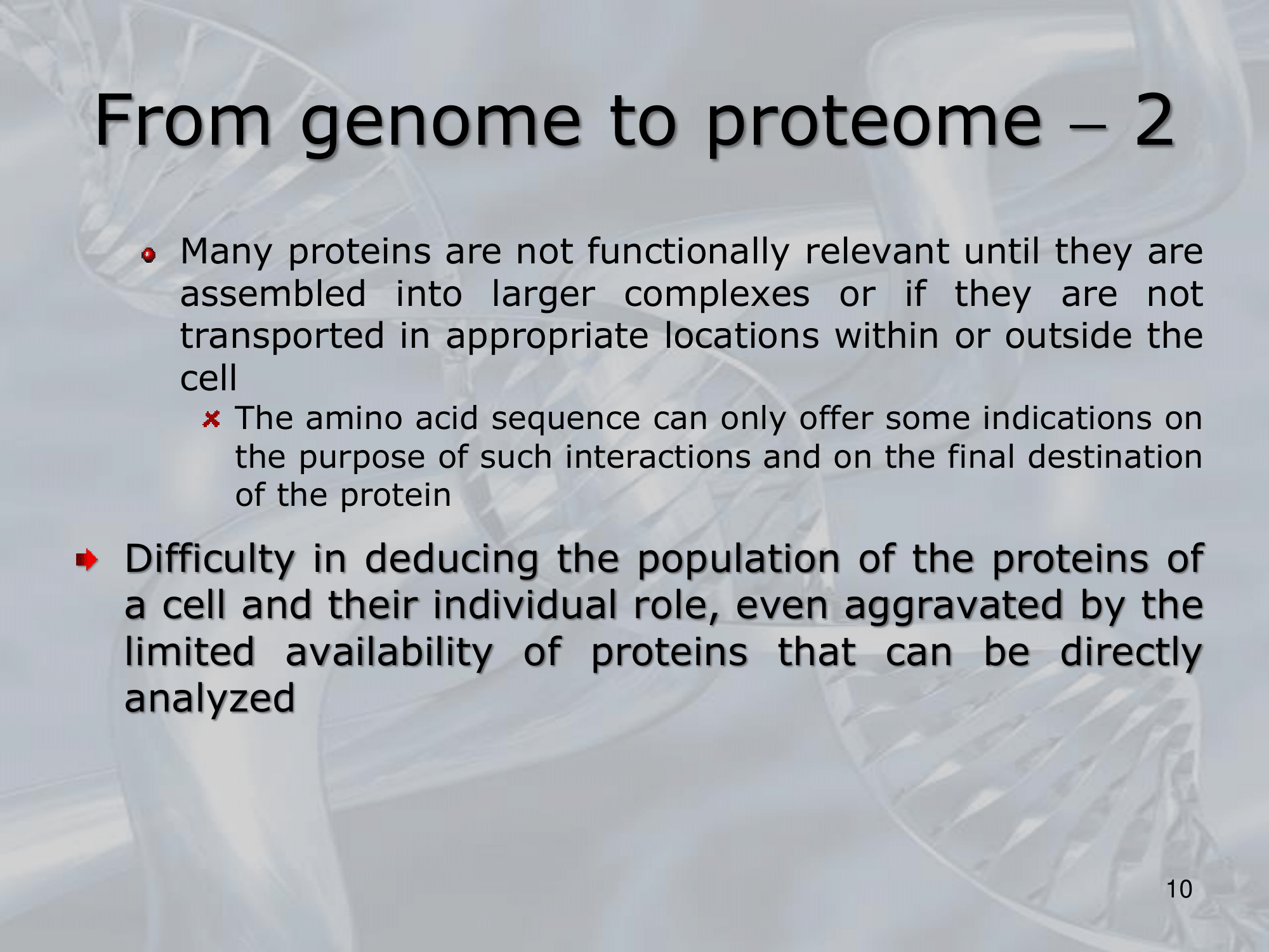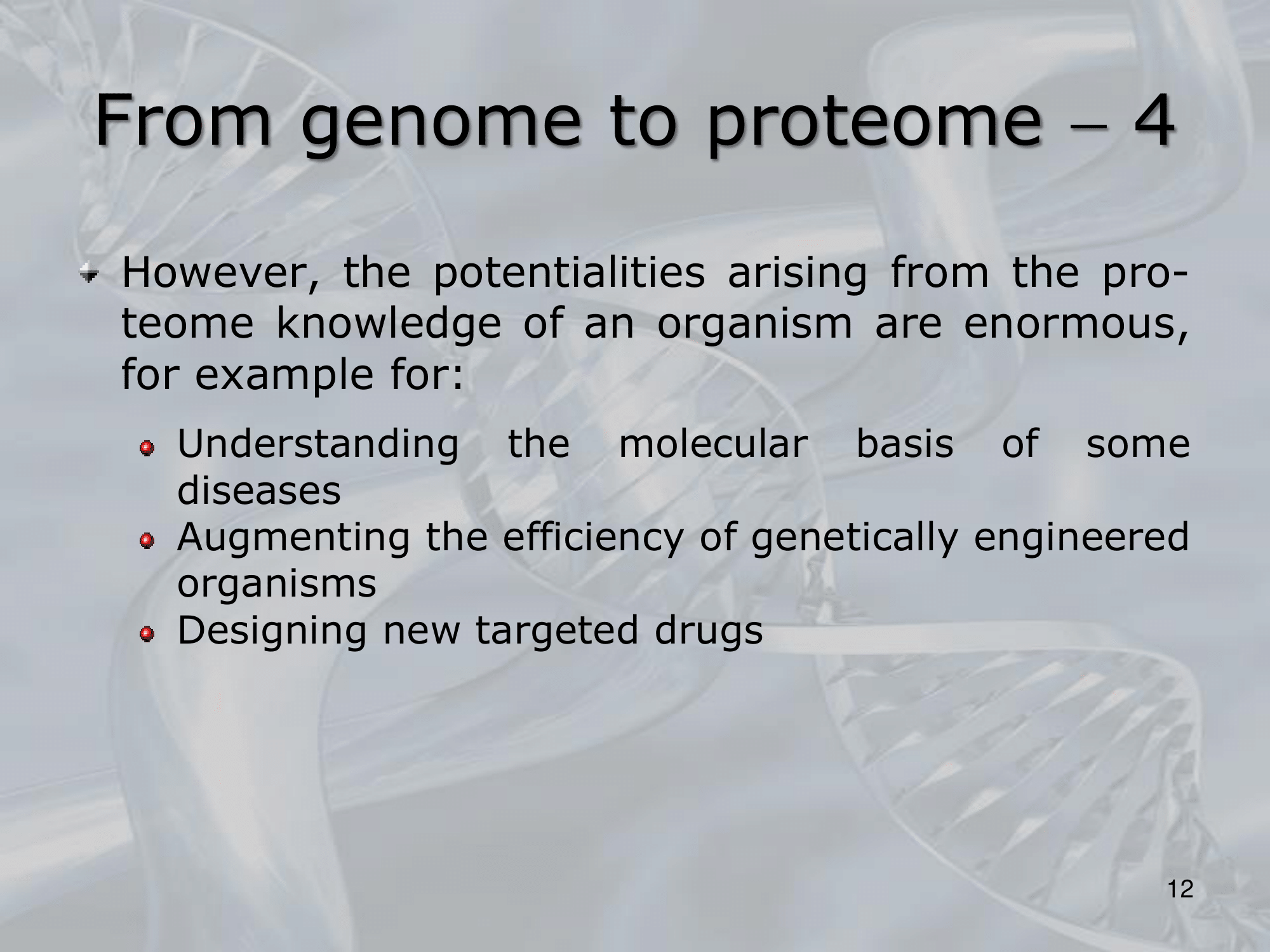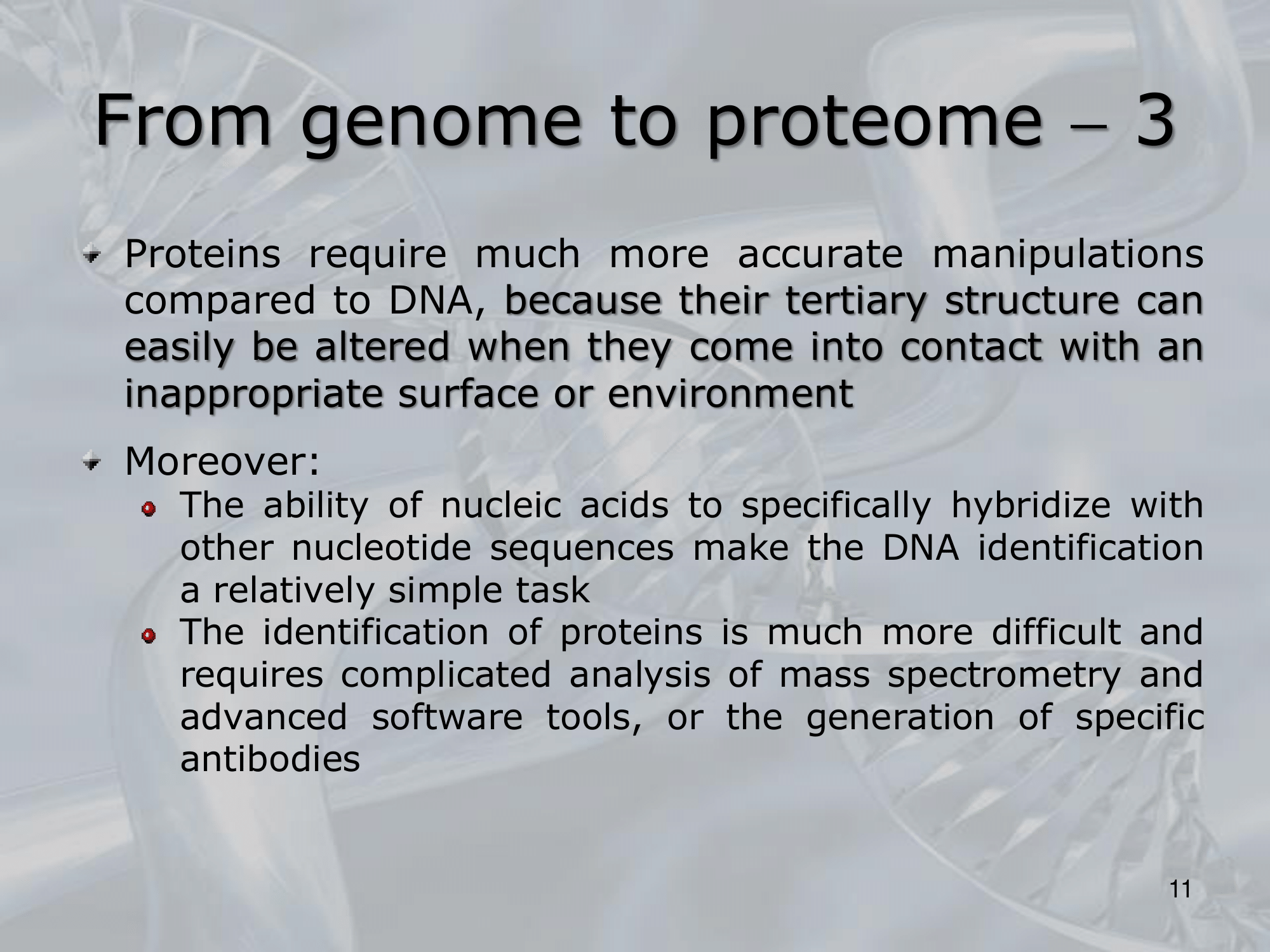IMPORTANTE Protein are difficult to study also because, their tetriary structure can easly be altered when they come into contact with an inappropiate surface or environment. While the DNA is much simpler to study. Tho if we can understand the proteome of an organism we can also understand the base and cause of a possible disease, and we can design target drugs for that specific organism (targeted medicine), also we can increase the efficency of genetically engineered organisms.