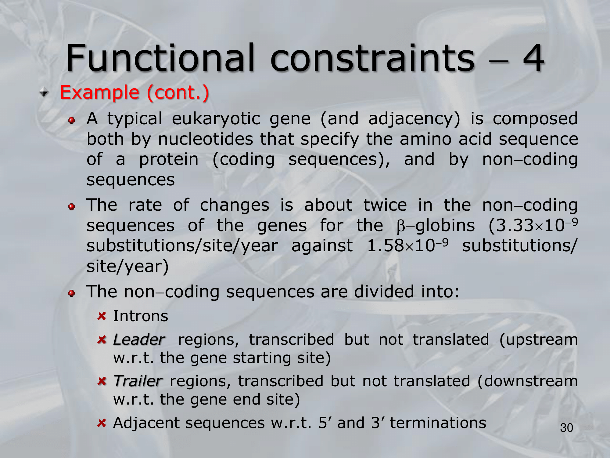 IMPORTANTE Tutti i cambiamenti che diminuiscono la durata media di vita di un organismo vengono eliminati dalla selezione naturale. #IMPORTANTE Nelle sequenze nucleotidiche esistono functional constraints che limitano le mutazioni su alcune sequenze nucleotidiche. Al contrario molti cambiamenti alle sequenze nucleotidiche non cambiamo la funzione della proteina tradotta, in questi casi cambiamenti su queste sequenze non sono fermati dalla soluzione naturale, e le mutazioni si accumulano rapidamente durante lâevoluzione. #IMPORTANTE Le sequenze non-codificanti si dividono in: Introni. Leader regions: regioni transcritte ma non tradotte (si trovano allâinizio delâending-site del gene). Trailer regions: regioni transcritte ma non tradotte (si trovano alla fine delâending-site del gene). Adjacent sequences rispetto alle terminazioni in e .