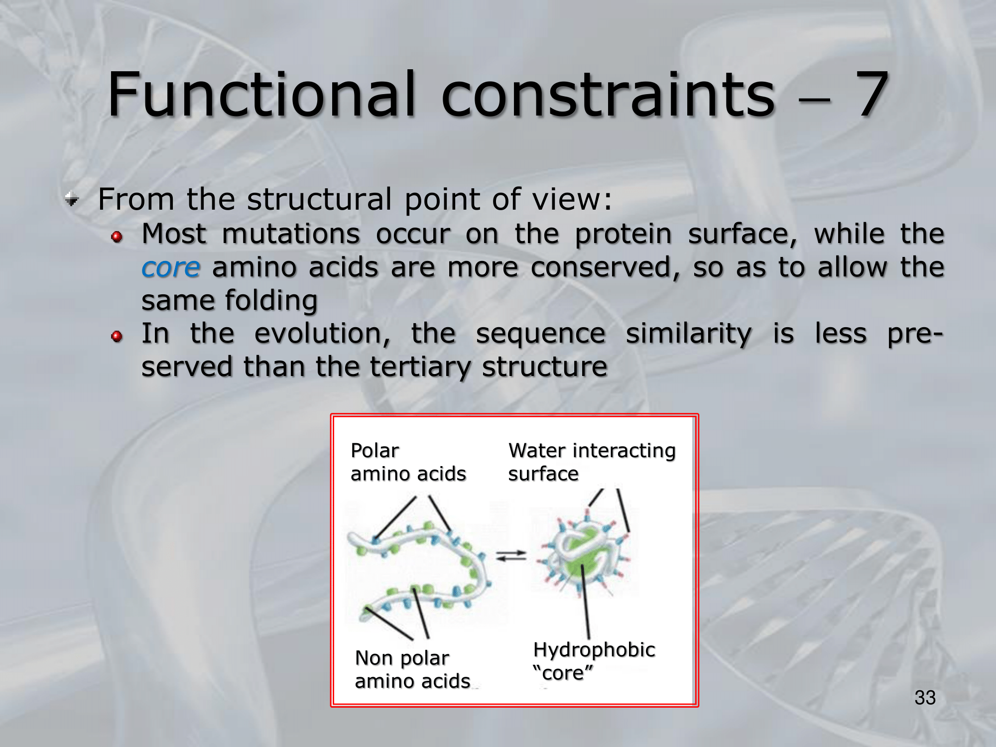 IMPORTANTE La maggior parte di mutazioni avvengono sulla superficie delle proteine, mentre vengono mantenuto il cuore della proteina, che determina la sua struttura, la struttura cerca di essere mantenuta. ~Ex.: Cambio di un amminoacido interno alla proteina: