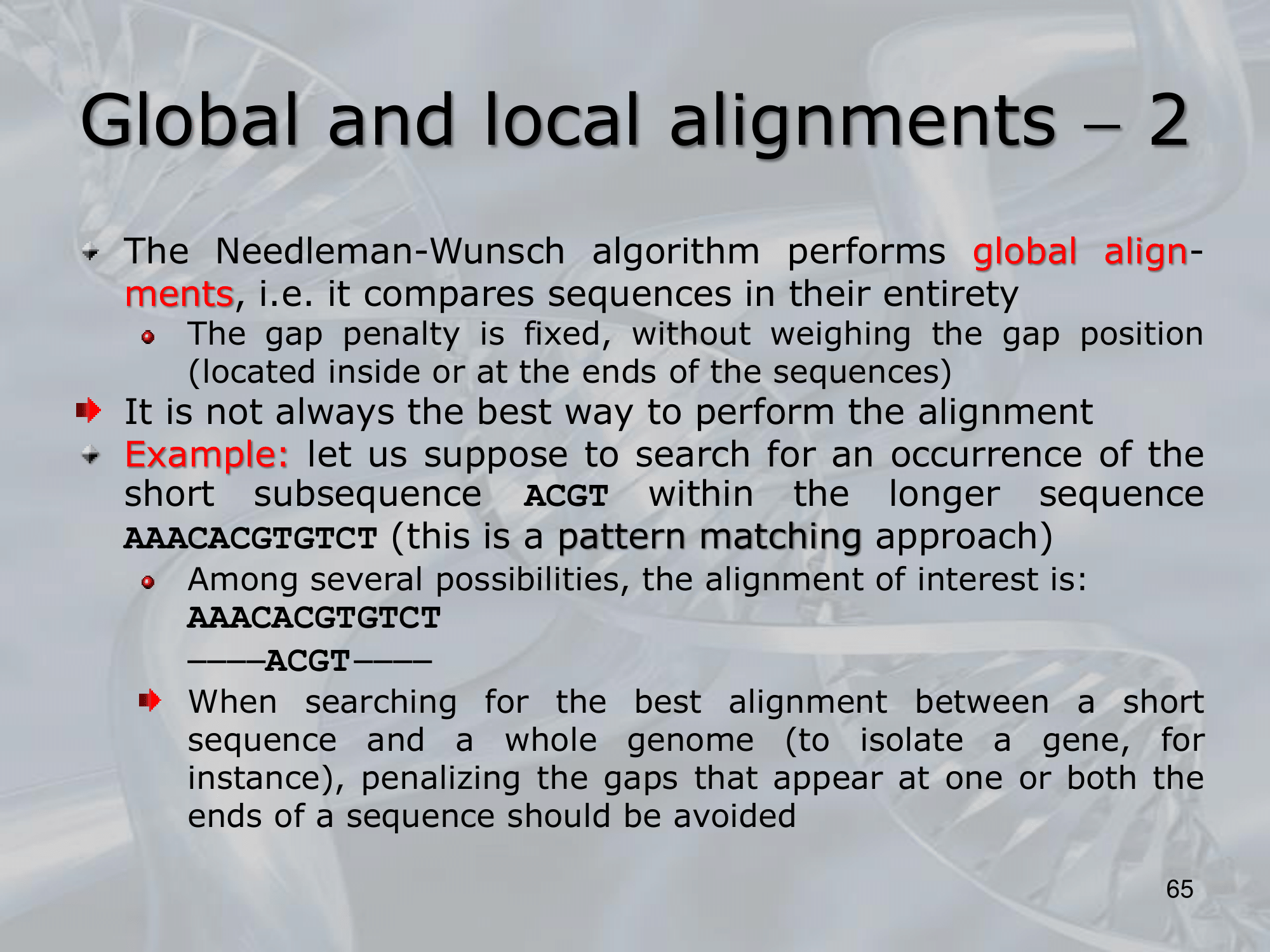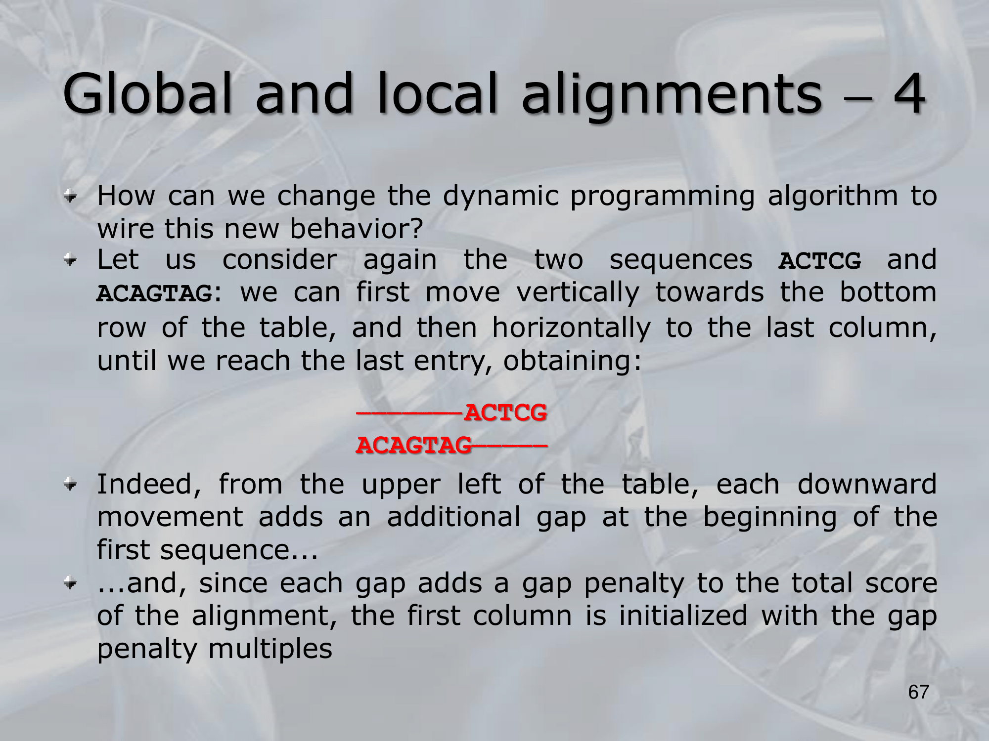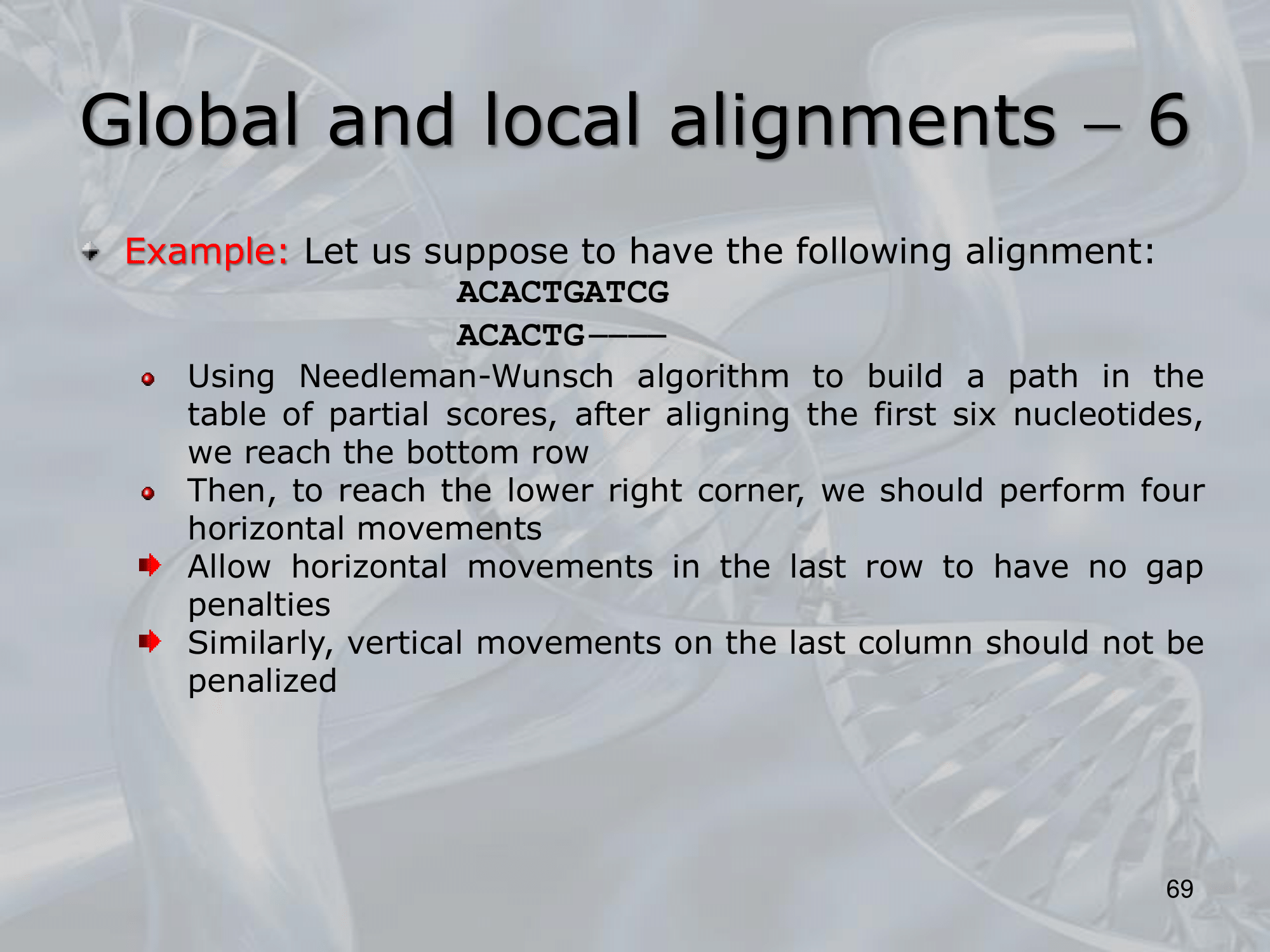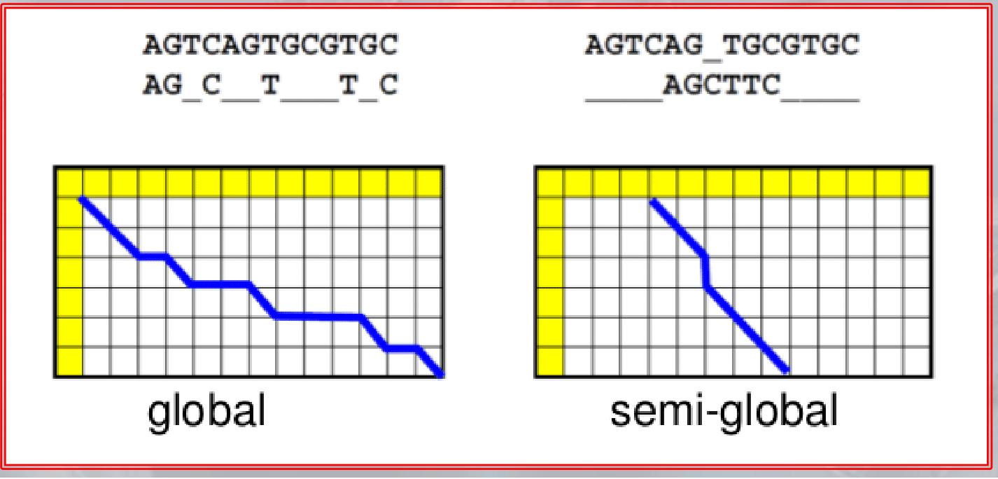IMPORTANTE Global and Semi-Global Alignments: The Needleman-Wunsch Algorithm preferes the global alignment, but we can change it to make it return the optimal solution for local alignment: