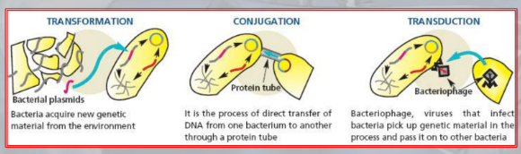 - Transformation: prokaryotes take up free fragments of DNA found in the enviroment, ofter plasmidis