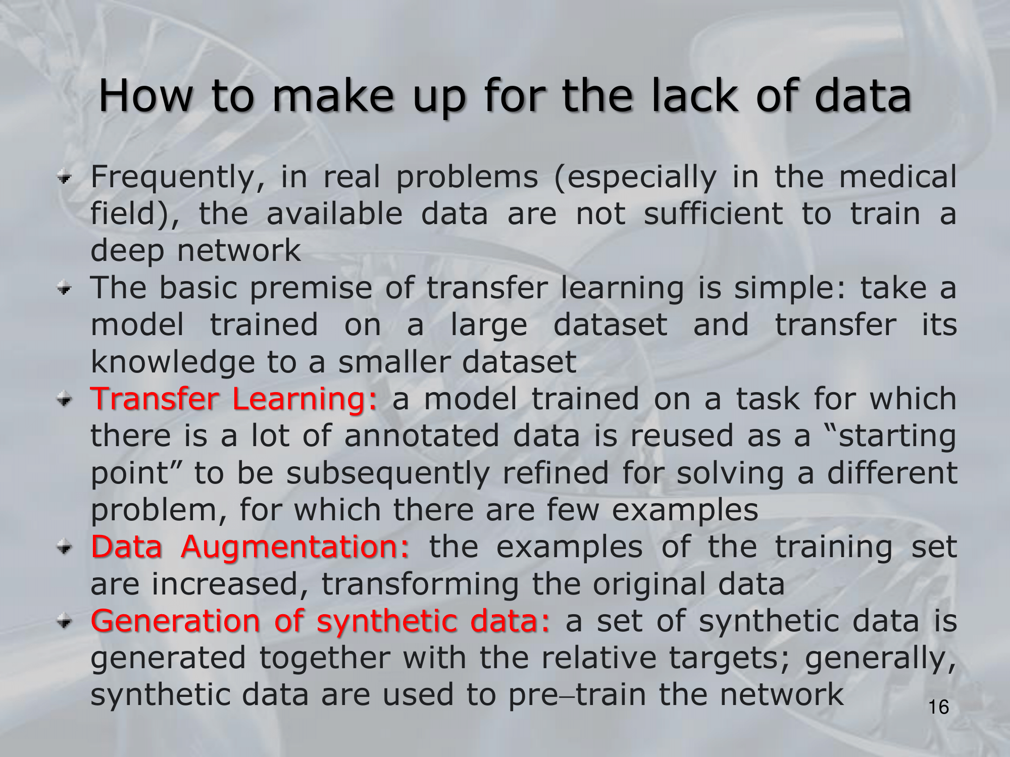 IMPORTANTE How to make up for the lack of data?: Transfer Learning Data Augumentation (alter already existing data, and consider them as new data) Generation of Synthetic Data: (use ML approach, like GANs Generative Adversarila Networks, to create new data, on the basis of what data we have)