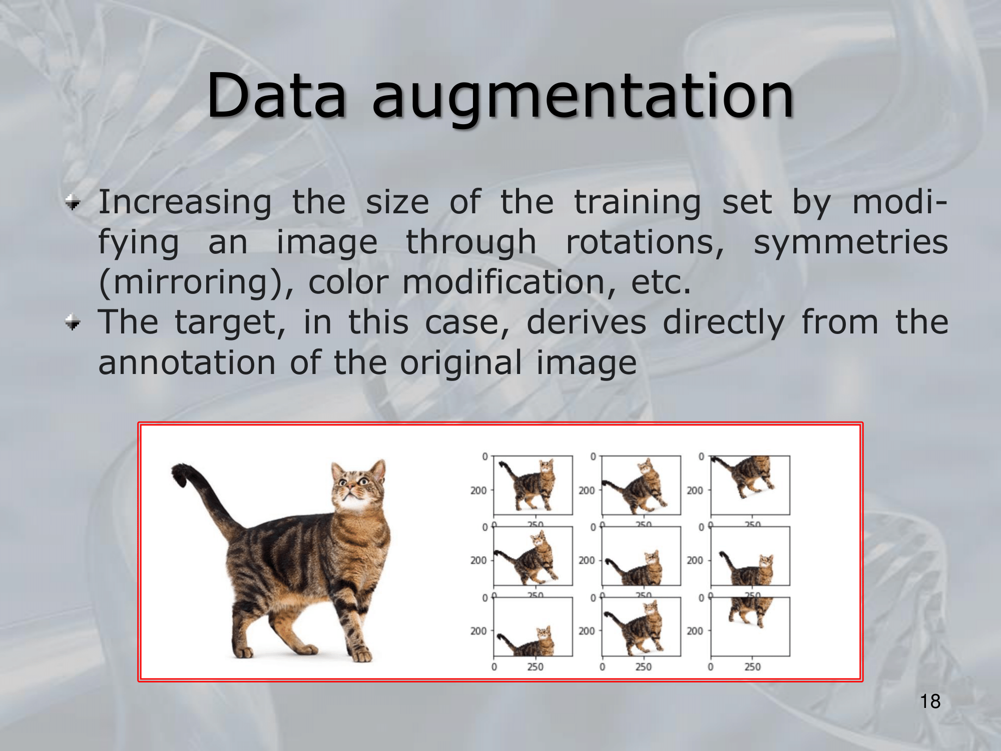 By applying data augmentation techniques to the smaller classes, we can balance the number of examples for each class and improve model performance. - Overall, data augmentation is a powerful technique for improving the robustness and performance of machine learning models, and it is often used in combination with other techniques such as transfer learning and regularization.