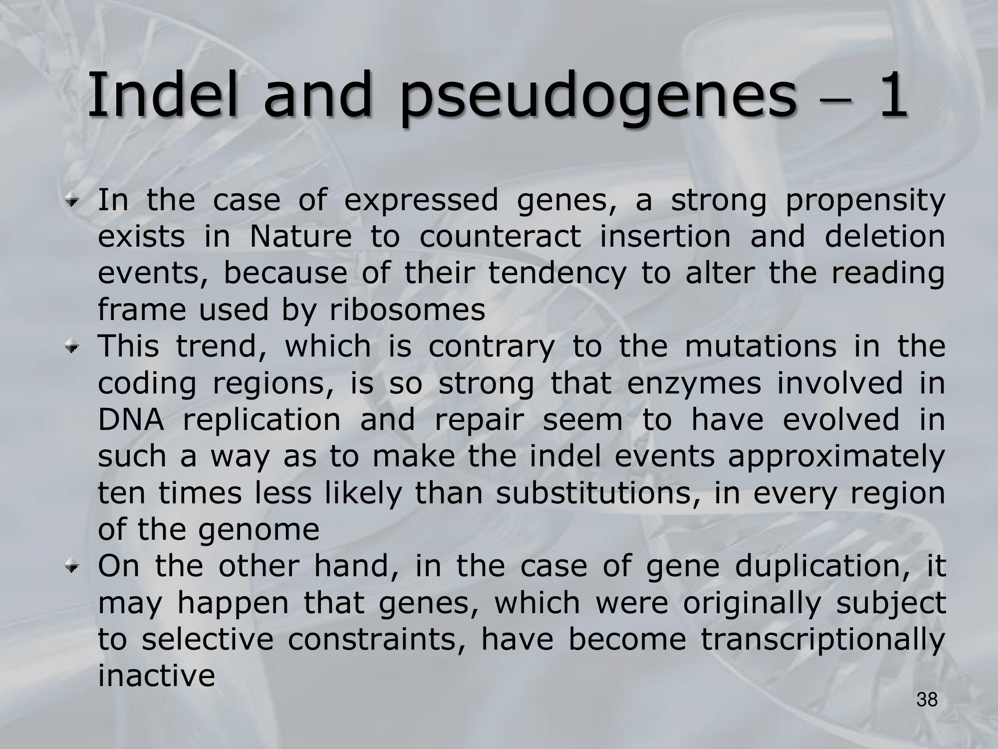 IMPORTANTE Un evento indel è una mutazione talmente forte nei siti di codifica (cambia moltissimi amminoacidi tutti insieme) che sia gli enzimi coinvolti durante la replicazione del DNA e quelli coinvolti nella riparazione post replicazione, si sono evoluti rendendo gli eventi indel sono volte meno probabili che le mutazioni puntuali.