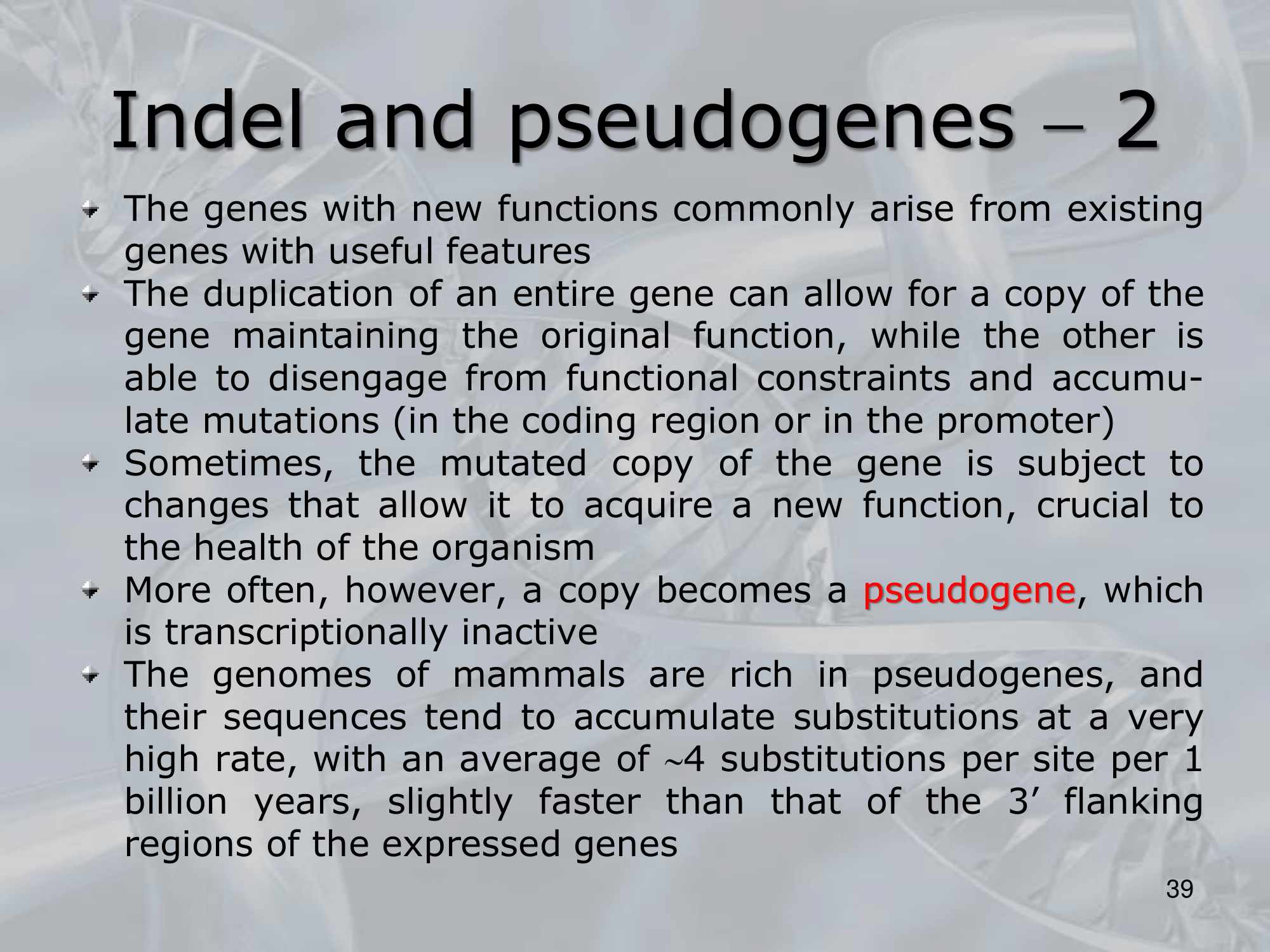 IMPORTANTE Pseudogeni: Quando un gene viene duplicato, spesso si forma uno pseudogene che è però inattivo, i mammiferi sono ricchi di pseudogeni nel loro DNA, e questi non sono protetti dai cambiamenti a differenza dei geni (codificanti), abbiamo che negli pseudogeni abbiamo una sostiuzione di ~ geni ogni MILIARDO di anni (molto veloce)