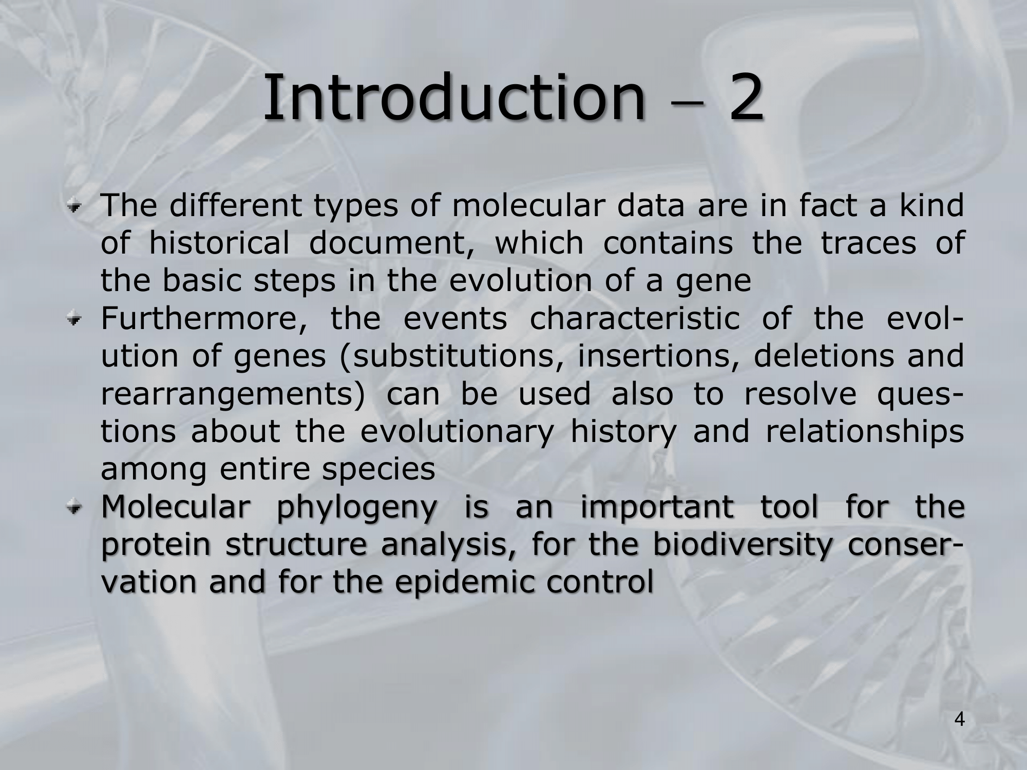It provides a powerful tool for reconstructing the evolutionary history of life on Earth, as it allows us to trace the pattern of divergence and diversification of species over time. - Molecular phylogenetics involves the use of various methods, such as maximum likelihood and Bayesian inference, to analyze the molecular data and construct evolutionary trees or phylogenies.