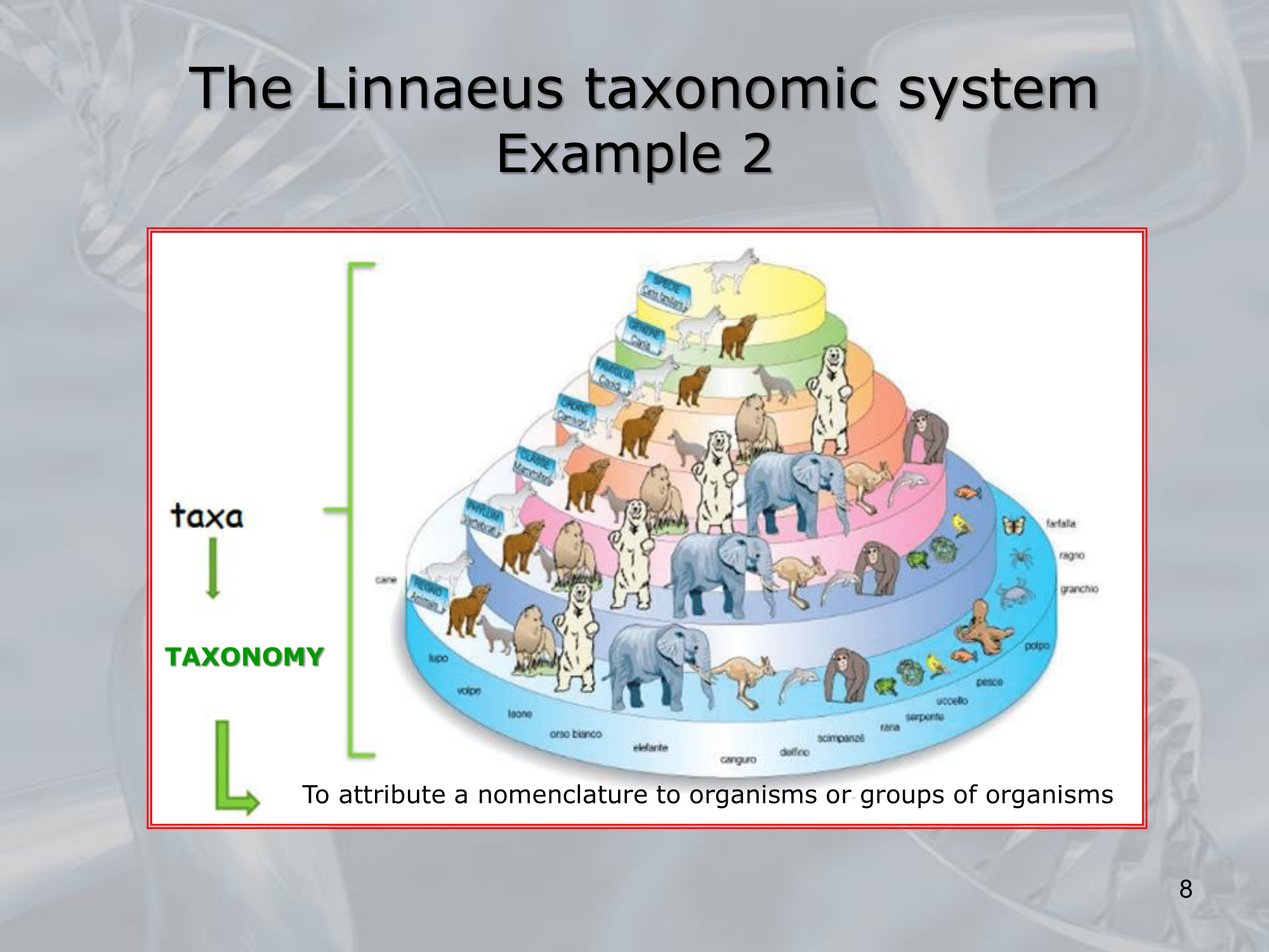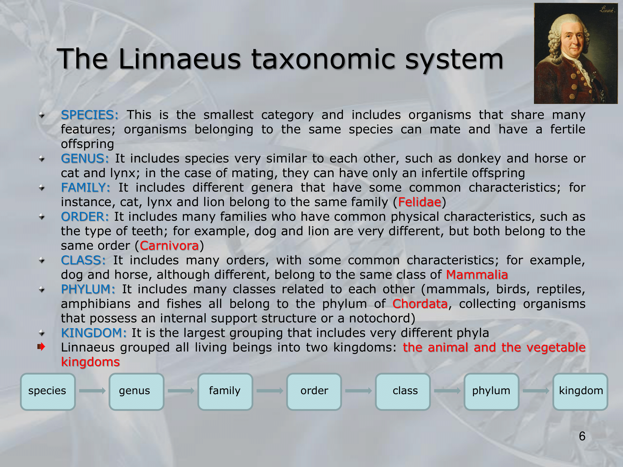 IMPORTANTE Taxonomy: si occupa di nomenclare le diverse specie. #IMPORTANTE Linnaeus taxonomic systes: KINDOM â PHYLUM â CLASS â ORDER â FAMILY â GENUS â SPECIES Lâuomo si raggruppa in: Animal and vegetable kindom Chordata Mammalia Carnivora Felidae Human