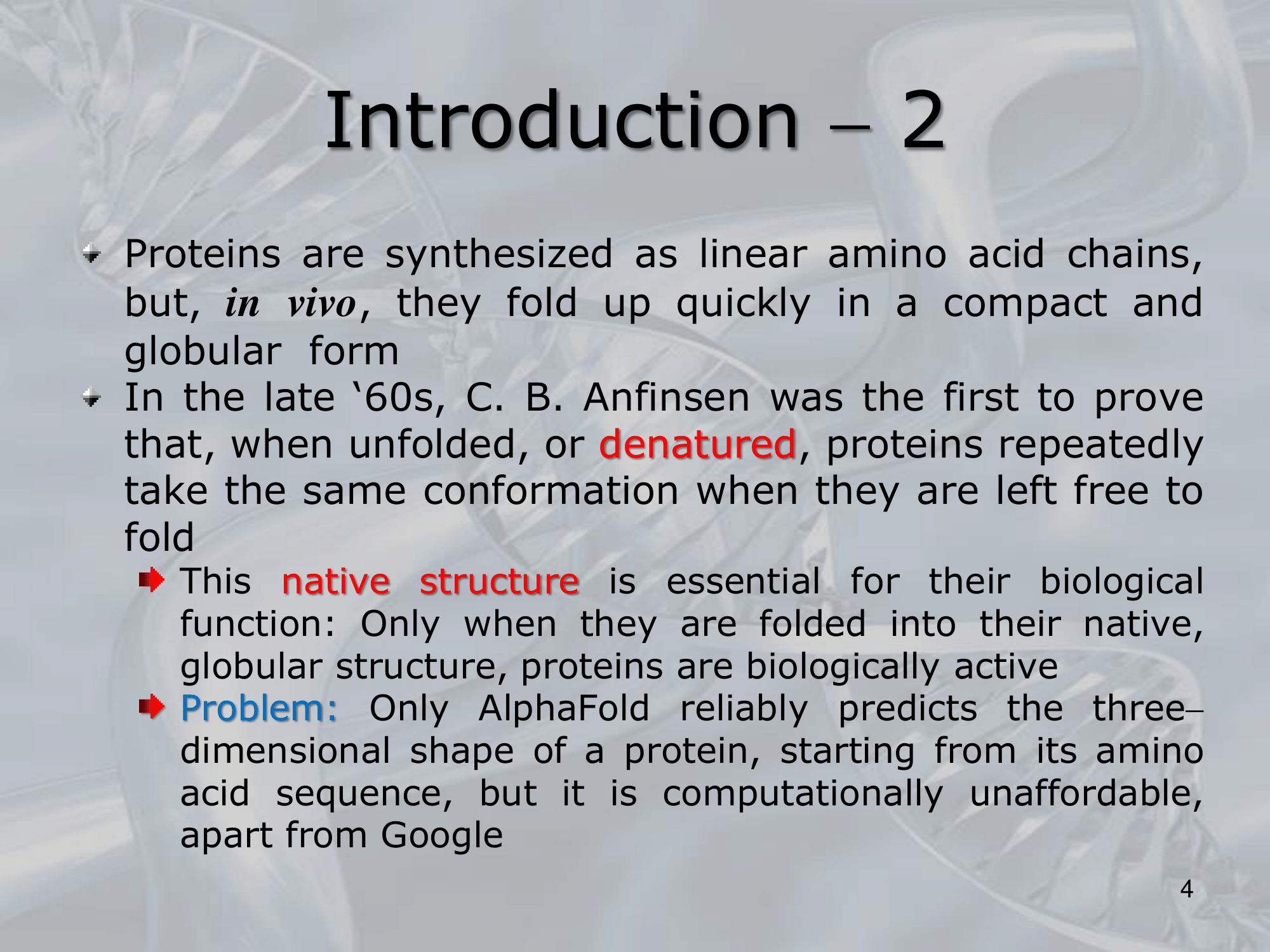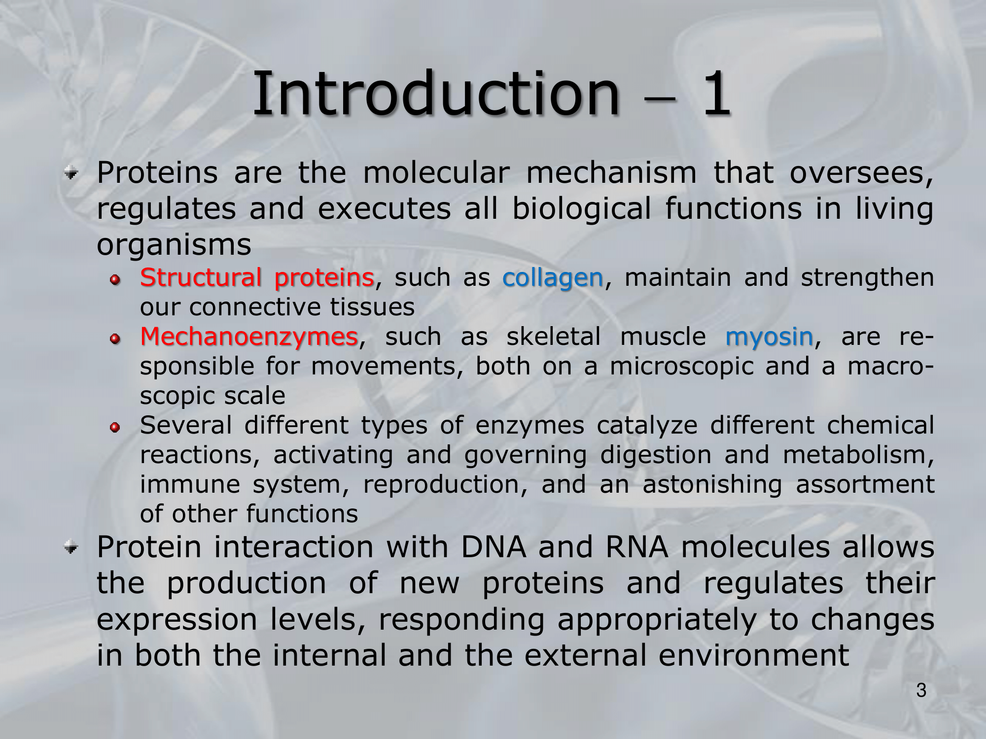 IMPORTANTE Strucutral Proteins come il collagene, mantengano e rafforzano i nostri tessuti connettivi #IMPORTANTE Mechanoenzymes come la miosina, sono responsabili per il movimento, microscopico e macroscopico. #IMPORTANTE Enzymes (in generale) fungono da catalizzatori per diverse reazioni chimiche. #IMPORTANTE Lâinterazione di proteine con il DNA ed lâRNA permette di creare nuove proteine e regolarne la loro espressione #IMPORTANTE Protein Folding: