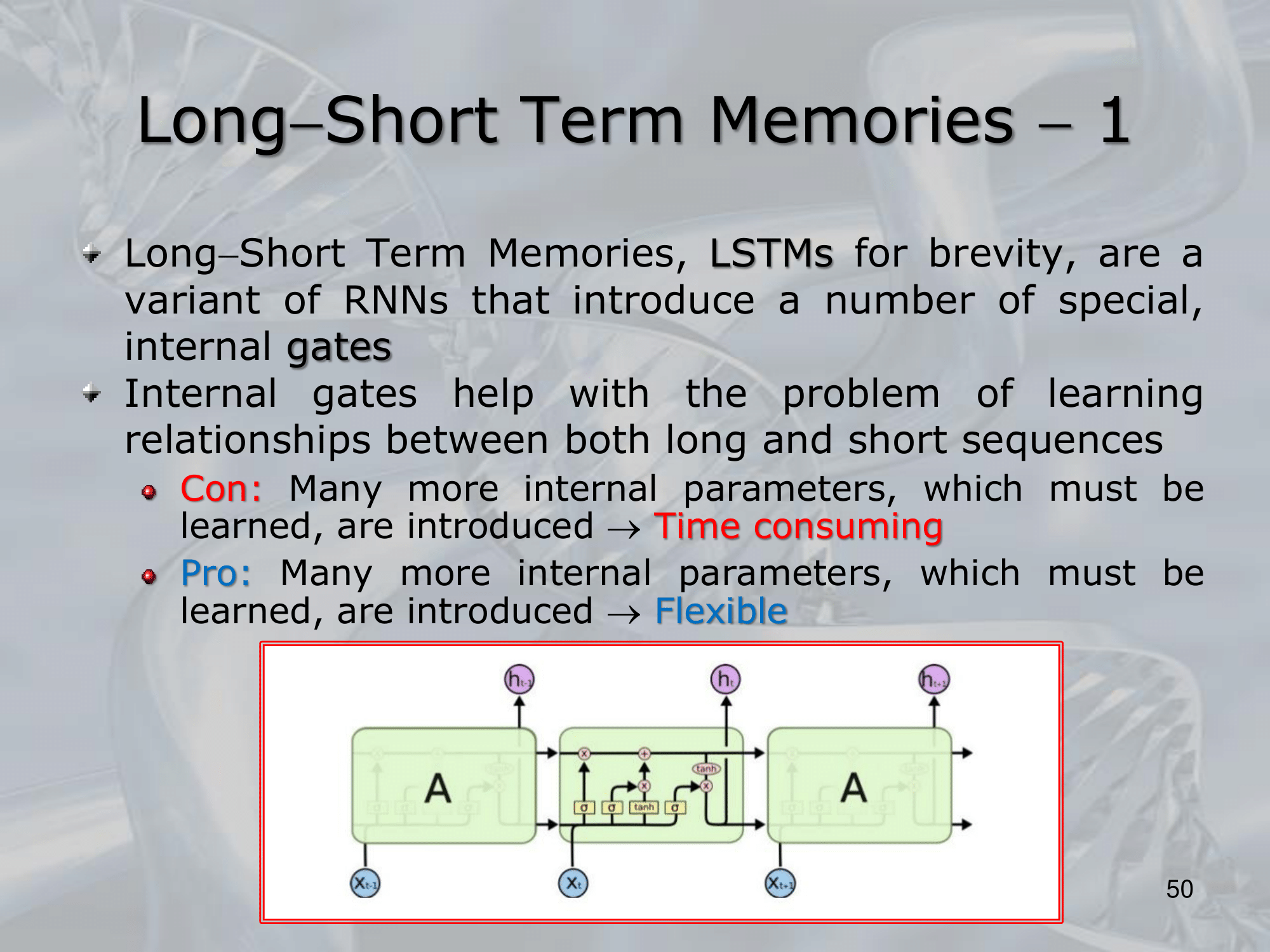 • Long-Short Term Memories (LSTMs) are a type of recurrent neural network architecture that is designed to address the vanishing/exploding gradient problem and improve the network’s ability to capture long-term dependencies in sequential data.