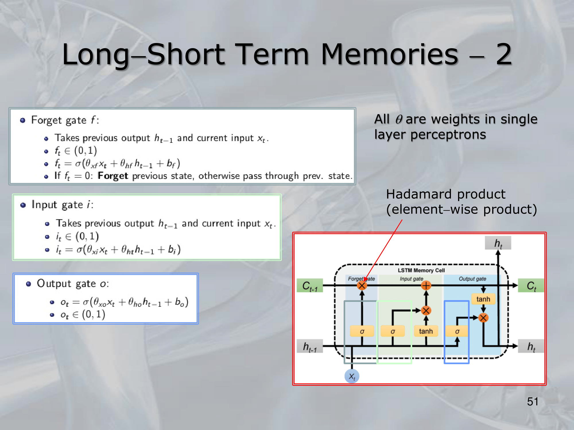 • ==The forget gate controls how much information is retained from the previous memory state==.
